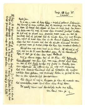 Er is een - naar ik hoop klein - ongeluk gebeurd. Gistermiddag, terwijl ik even uitliep, gaf de concierge me een brief van je. Daar ik haast had, stopte ik hem in mijn zak. Een kwartier later was hij weg, ik moet hem ernaast ‘gestopt’ hebben. Ik heb nog op straat enz. gezocht, maar niks, en tot op vandaag had ik gehoopt dat de vinder hem mij nog brengen zou, want ik moet hem hier in de buurt hebben verloren. Maar het ziet ernaar uit dat de vinder ditmaal curieus is geweest naar je proza. (Moge het hem zijn verstand kosten!)