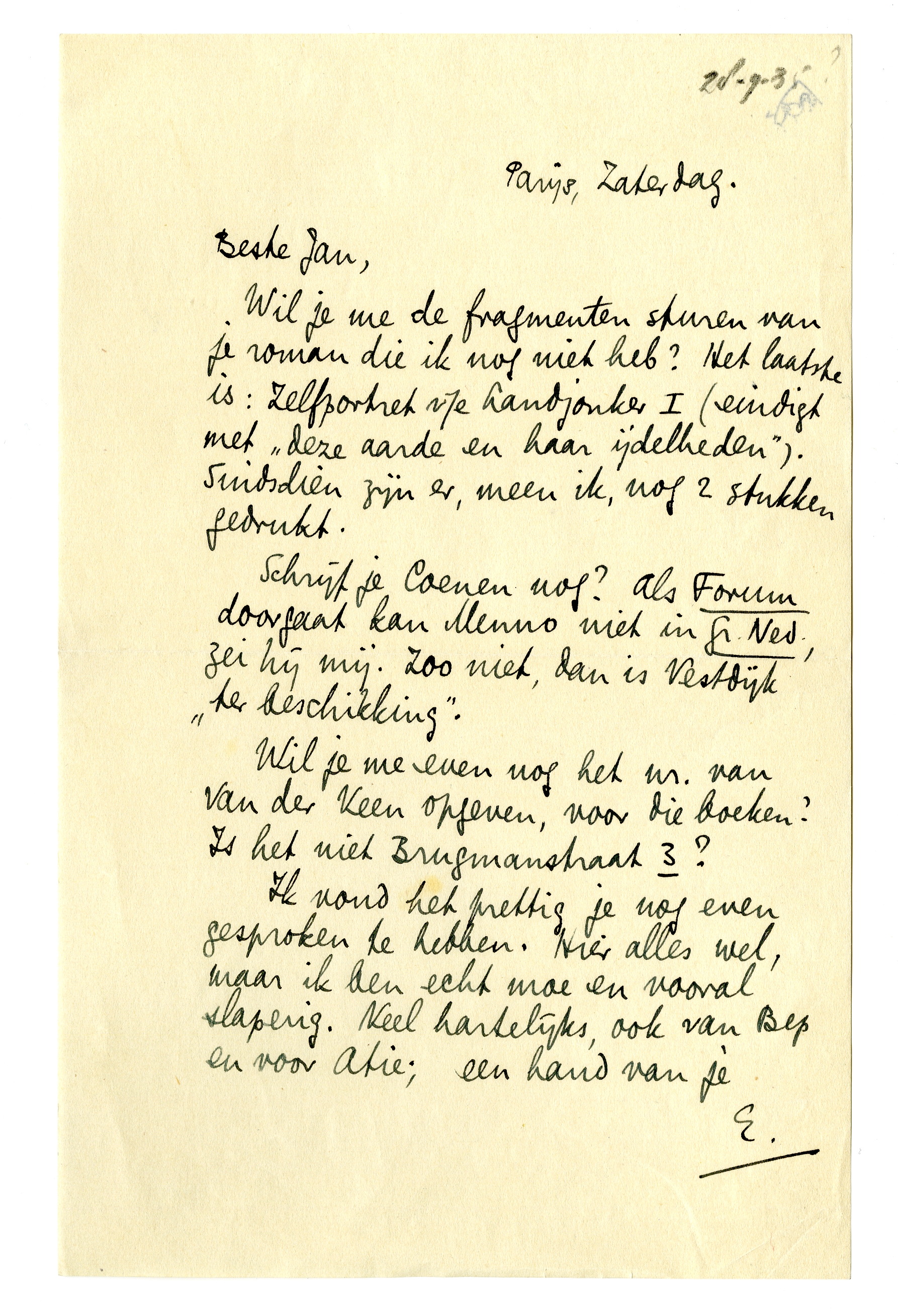 Schrijf je Coenen nog? Als Forum doorgaat kan Menno niet in Gr. Ned., zei hij mij. Zoo niet, dan is Vestdijk ‘ter beschikking’.