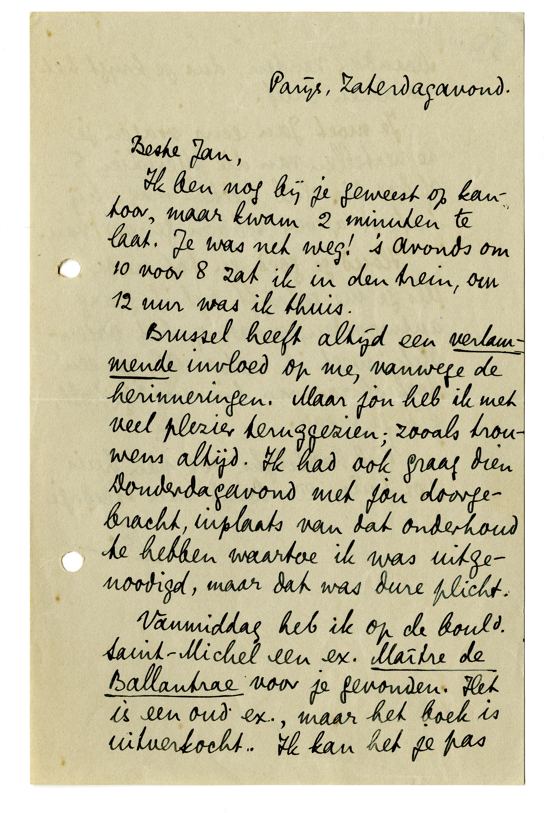 Vanmiddag heb ik op de bould. Saint-Michel een ex. Maître de Ballantrae3875 voor je gevonden. Het is een oud ex., maar het boek is uitverkocht. Ik kan het je pas Maandag zenden, dus je krijgt het na dezen brief.