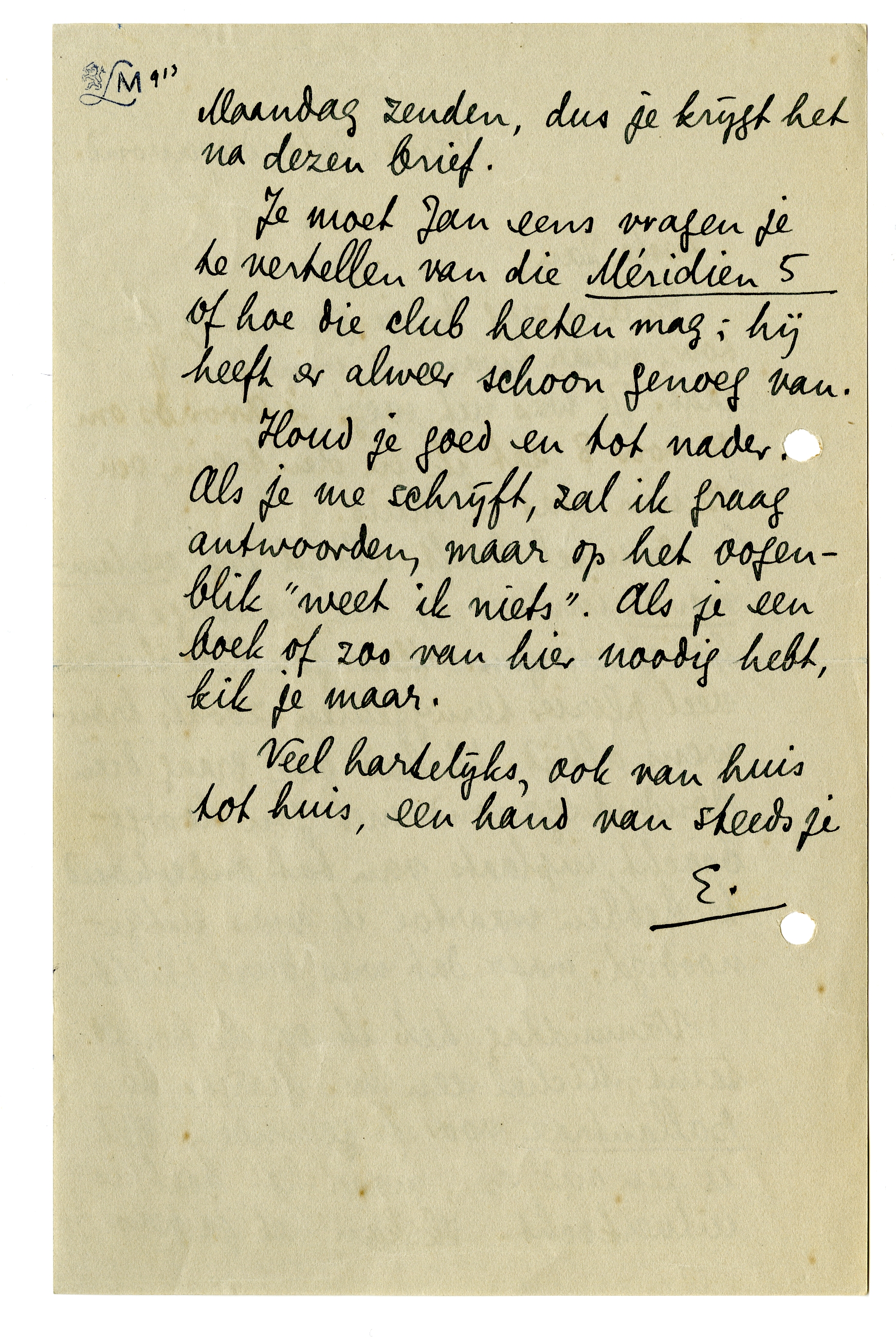 Houd je goed en tot nader. Als je me schrijft, zal ik graag antwoorden, maar op het oogenblik ‘weet ik niets’. Als je een boek of zoo van hier noodig hebt, kik je maar.