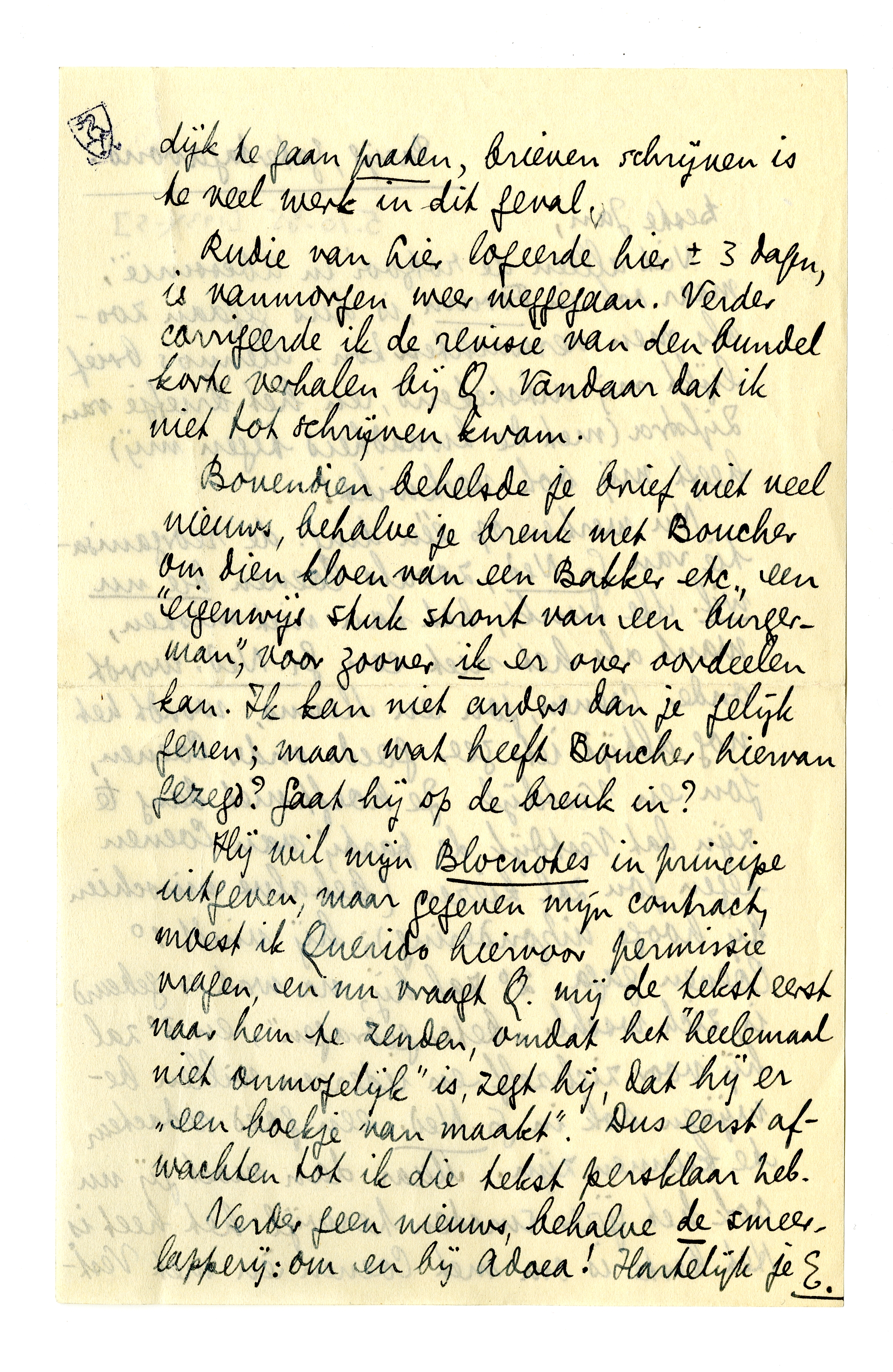 Bovendien behelsde je brief niet veel nieuws, behalve je breuk met Boucher om dien kloen van een Bakker3879 etc., een ‘eigenwijs stuk stront van een burgerman’, voor zoover ik er over oordeelen kan. Ik kan niet anders dan je gelijk geven; maar wat heeft Boucher hiervan gezegd? Gaat hij op de breuk in?