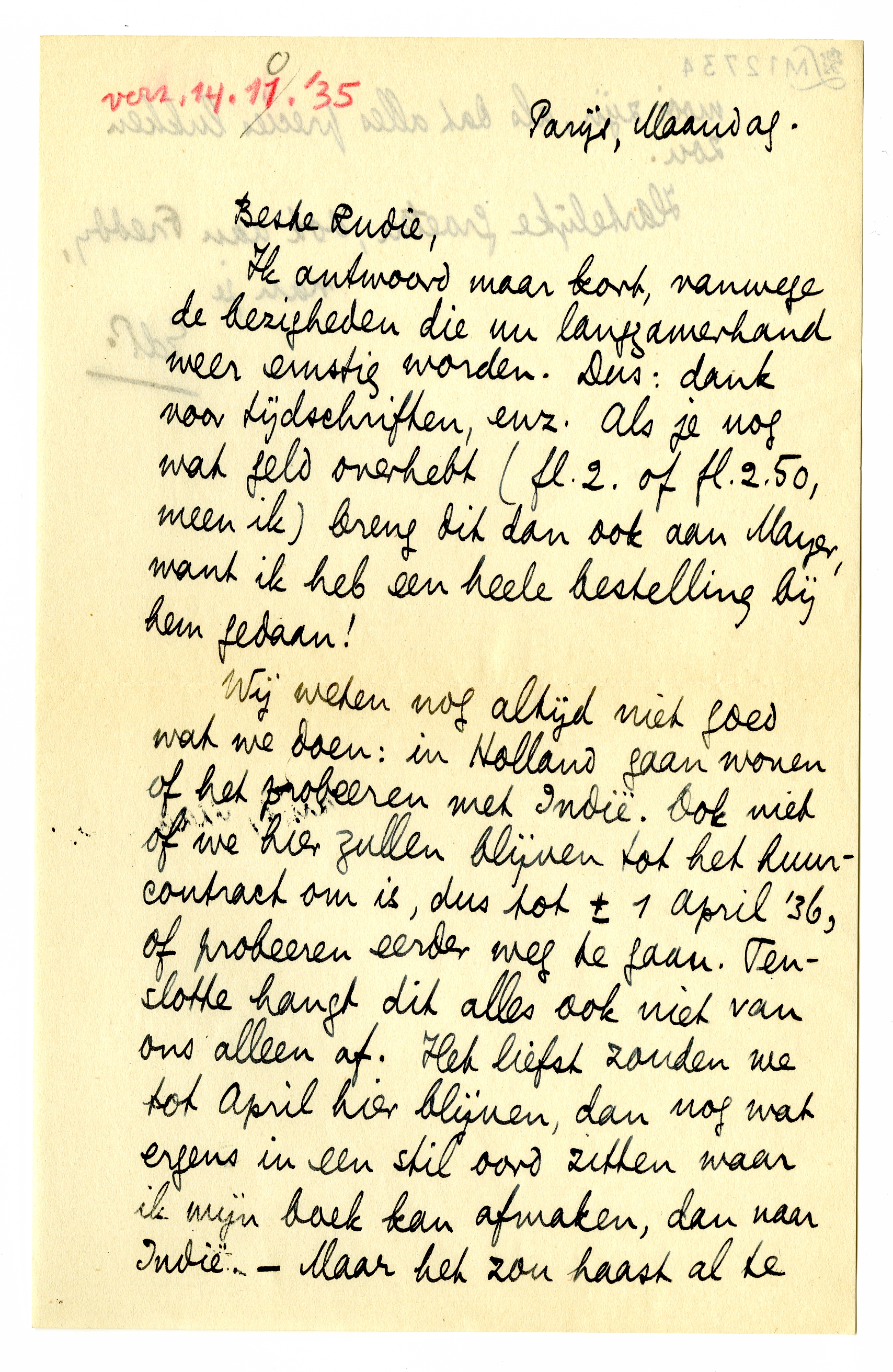 Wij weten nog altijd niet goed wat we doen: in Holland gaan wonen of het probeeren met Indië. Ook niet of we hier zullen blijven tot het huurcontract om is, dus tot ± 1 April '36, of probeeren eerder weg te gaan. Tenslotte hangt dit alles ook niet van ons alleen af. Het liefst zouden we tot April hier blijven, dan nog wat ergens in een stil oord zitten waar ik mijn boek kan afmaken, dan naar Indië. - Maar het zou haast al te mooi zijn, als dat alles precies lukken zou.