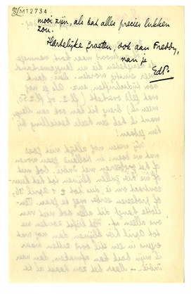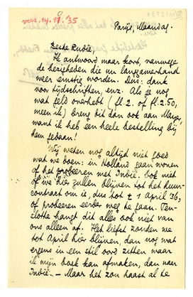 Ik antwoord maar kort, vanwege de bezigheden die nu langzamerhand weer ernstig worden. Dus: dank voor tijdschriften, enz. Als je nog wat geld overhebt (fl. 2. of fl. 2.50, meen ik) breng dit dan ook aan Mayer, want ik heb een heele bestelling bij hem gedaan!