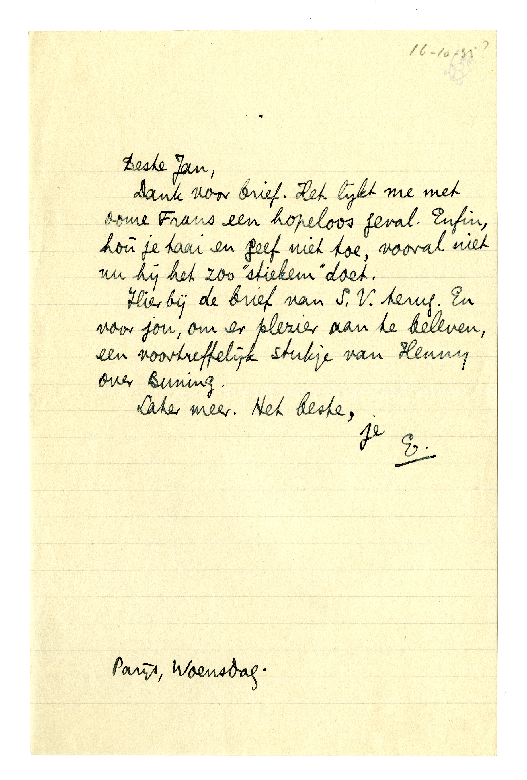 Hierbij de brief van S.V. terug. En voor jou, om er plezier aan te beleven, een voortreffelijk stukje van Henny over Buning.3888