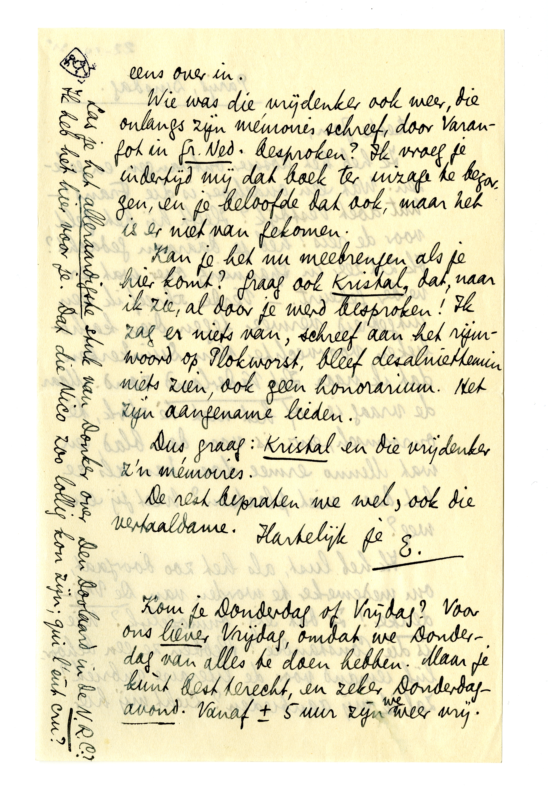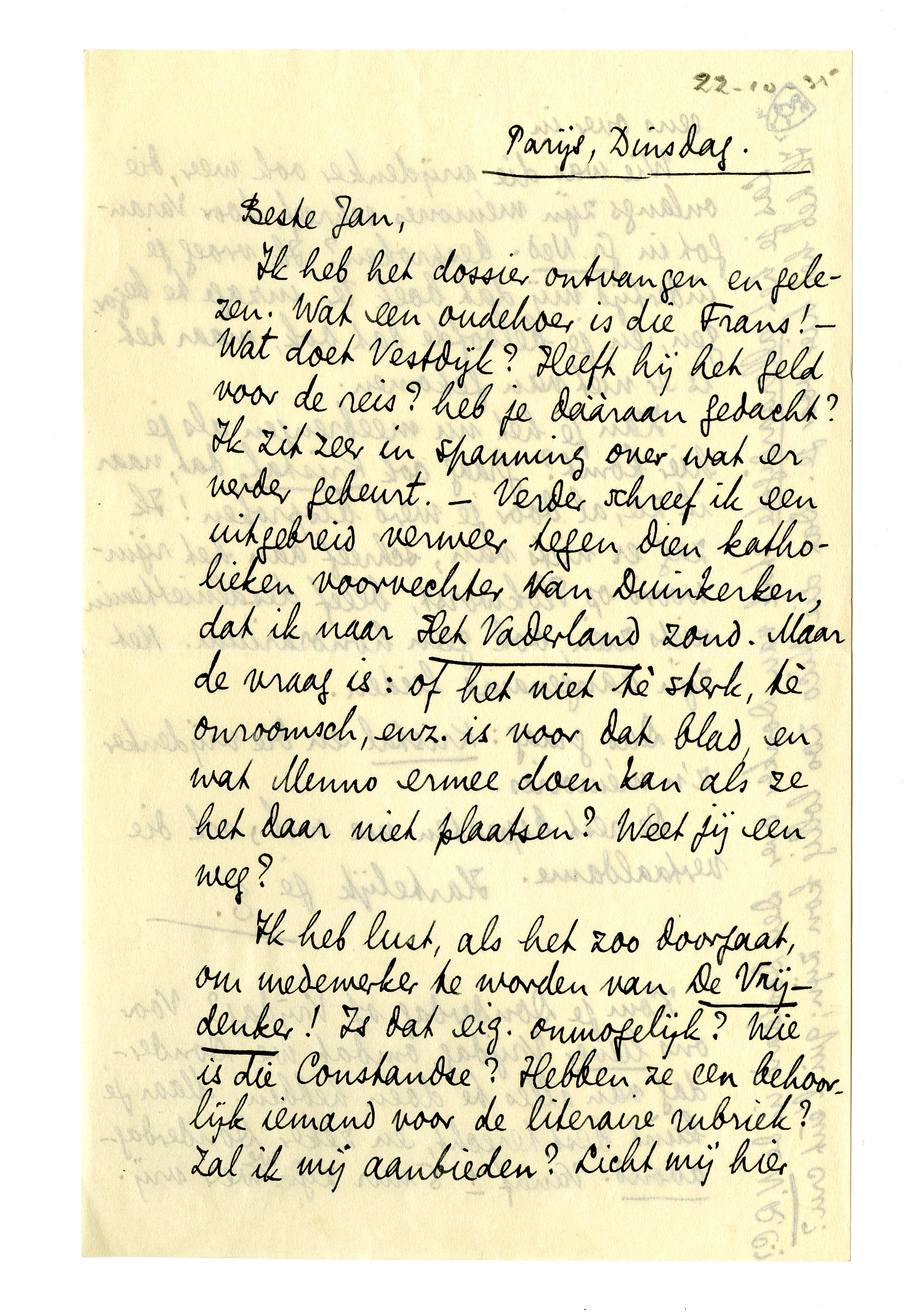 Ik heb het dossier ontvangen en gelezen. Wat een oudehoer is die Frans! - Wat doet Vestdijk? Heeft hij het geld voor de reis? heb je dààraan gedacht? Ik zit zeer in spanning over wat er verder gebeurt. - Verder schreef ik een uitgebreid verweer tegen dien katholieken voorvechter Van Duinkerken, dat ik naar Het Vaderland zond. Maar de vraag is: of het niet tè sterk, tè onroomsch, enz. is voor dat blad, en wat Menno ermee doen kan als ze het daar niet plaatsen?3892 Weet jij een weg?