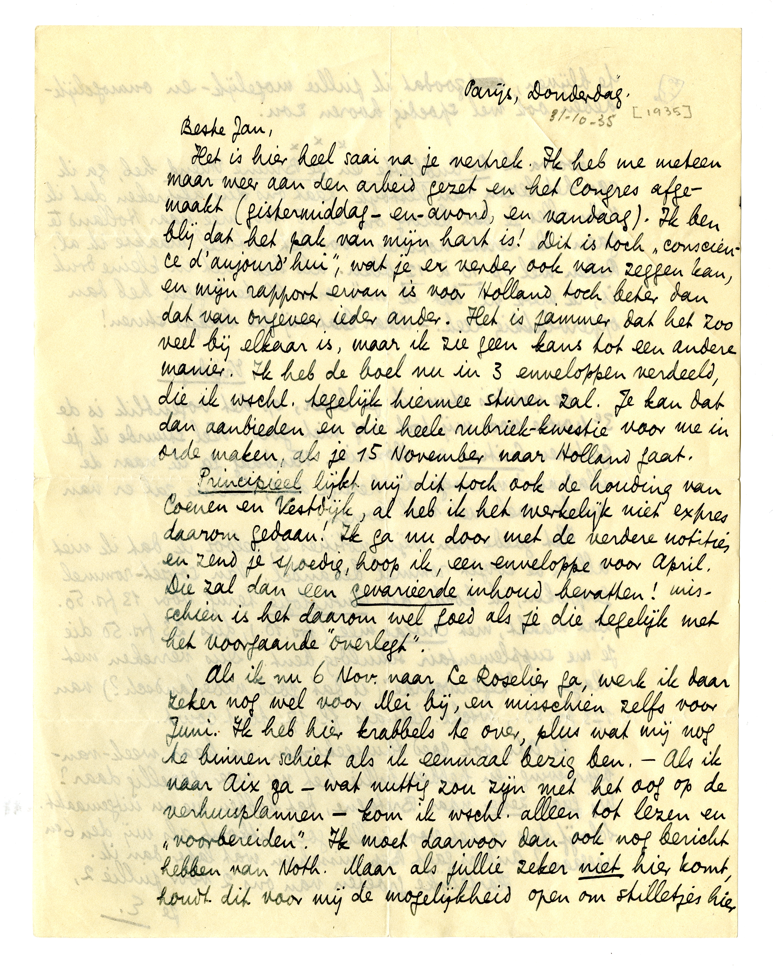 Het is hier heel saai na je vertrek. Ik heb me meteen maar weer aan den arbeid gezet en het Congres afgemaakt (gistermiddag-en-avond, en vandaag). Ik ben blij dat het pak van mijn hart is! Dit is toch ‘conscience d'aujourd'hui’, wat je er verder ook van zeggen kan, en mijn rapport ervan is voor Holland toch beter dan dat van ongeveer ieder ander. Het is jammer dat het zoo veel bij elkaar is, maar ik zie geen kans tot een andere manier. Ik heb de boel nu in 3 enveloppen verdeeld, die ik wschl. tegelijk hiermee sturen zal. Je kan dat dan aanbieden en die heele rubriek-kwestie voor me in orde maken, als je 15 November naar Holland gaat.