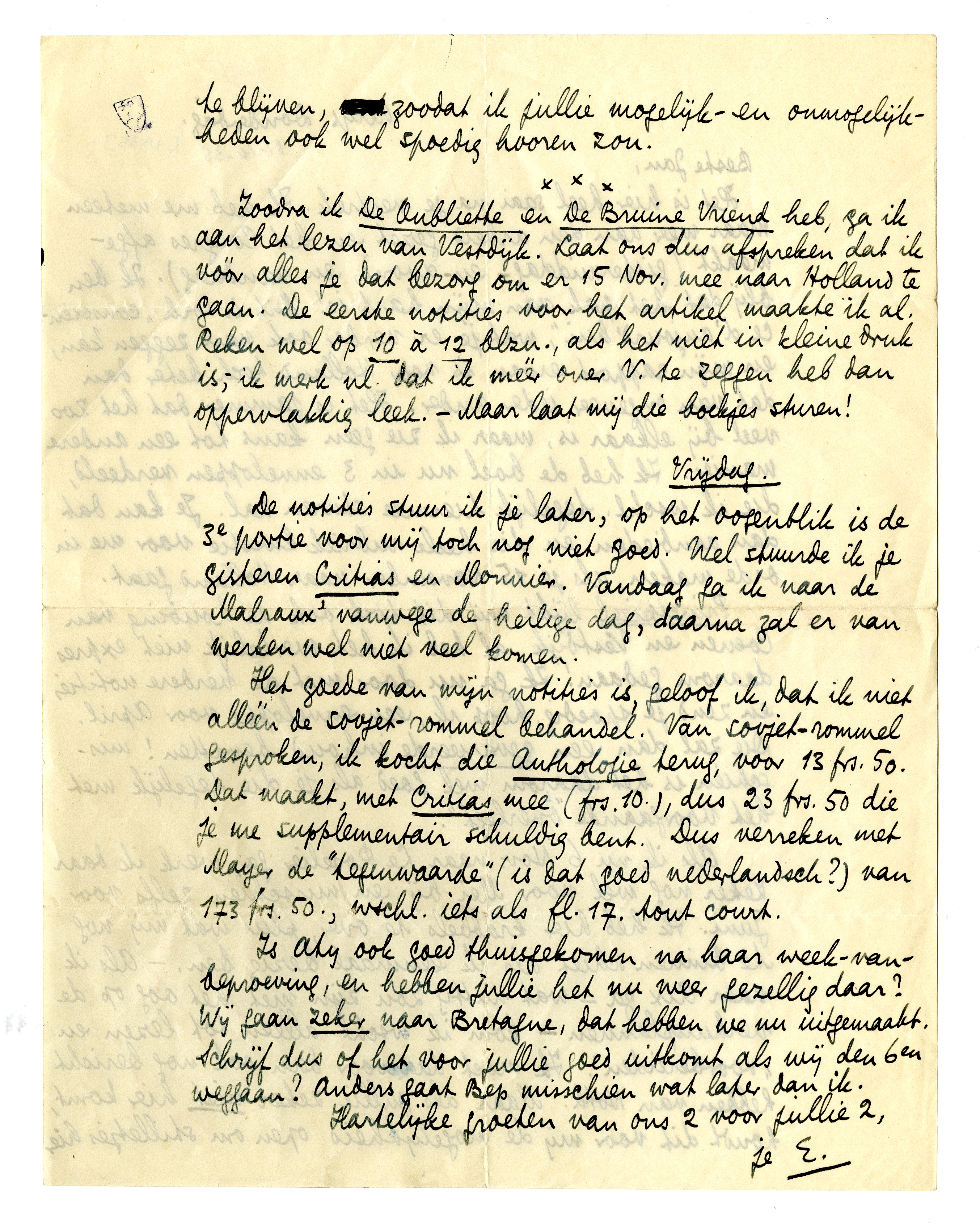 Het goede van mijn notities is, geloof ik, dat ik niet alléén de sovjet-rommel behandel. Van sovjet-rommel gesproken, ik kocht die Anthologie terug, voor 13 frs. 50. Dat maakt, met Critias mee (frs. 10), dus 23 frs. 50 die je me supplementair schuldig bent. Dus verreken met Mayer de ‘tegenwaarde’ (is dat goed nederlandsch?) van 173 frs. 50., wschl. iets als fl. 17. tout court.