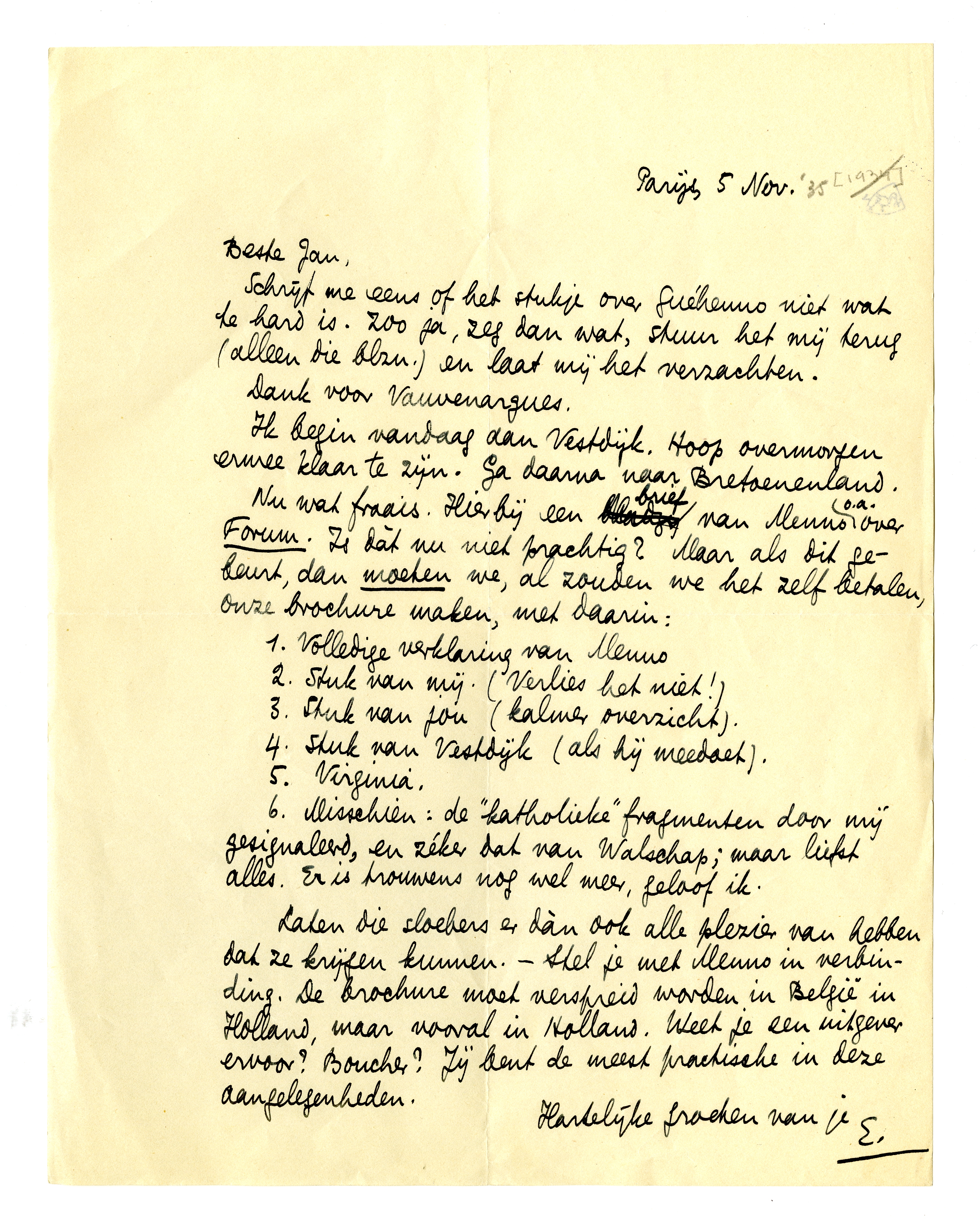 Schrijf me eens of het stukje over Guéhenno3910 niet wat te hard is. Zoo ja, zeg dan wat, stuur het mij terug (alleen die blzn.) en laat mij het verzachten.