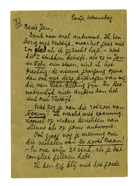 Dank voor snel antwoord. Ik ben bezig met Vestdijk, maar het gaat niet zoo glad als ik gedacht had. - Wat die 2 stukken betreft, als ze in Jan. en Febr. erin staan, vind ik het prachtig: de nieuwe jaargang opent dan ook met deze bijdragen van mij, die van zeker representatief belang zijn. In Dec. natuurlijk niets anders dan het stuk over Vestdijk.