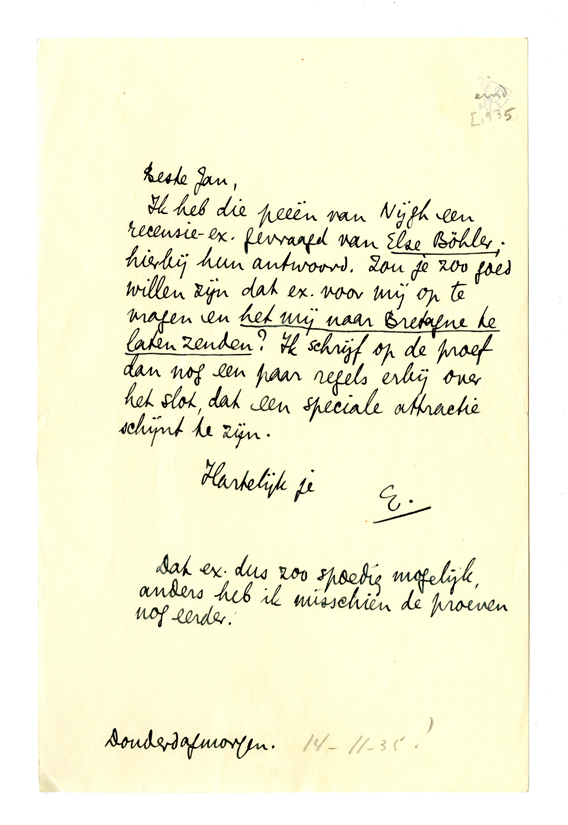 Ik heb die peeën van Nijgh een recensie-ex. gevraagd van Else Böhler; hierbij hun antwoord. Zou je zoo goed willen zijn dat ex. voor mij op te vragen en het mij naar Bretagne te laten zenden? Ik schrijf op de proef dan nog een paar regels erbij over het slot, dat een speciale attractie schijnt te zijn.