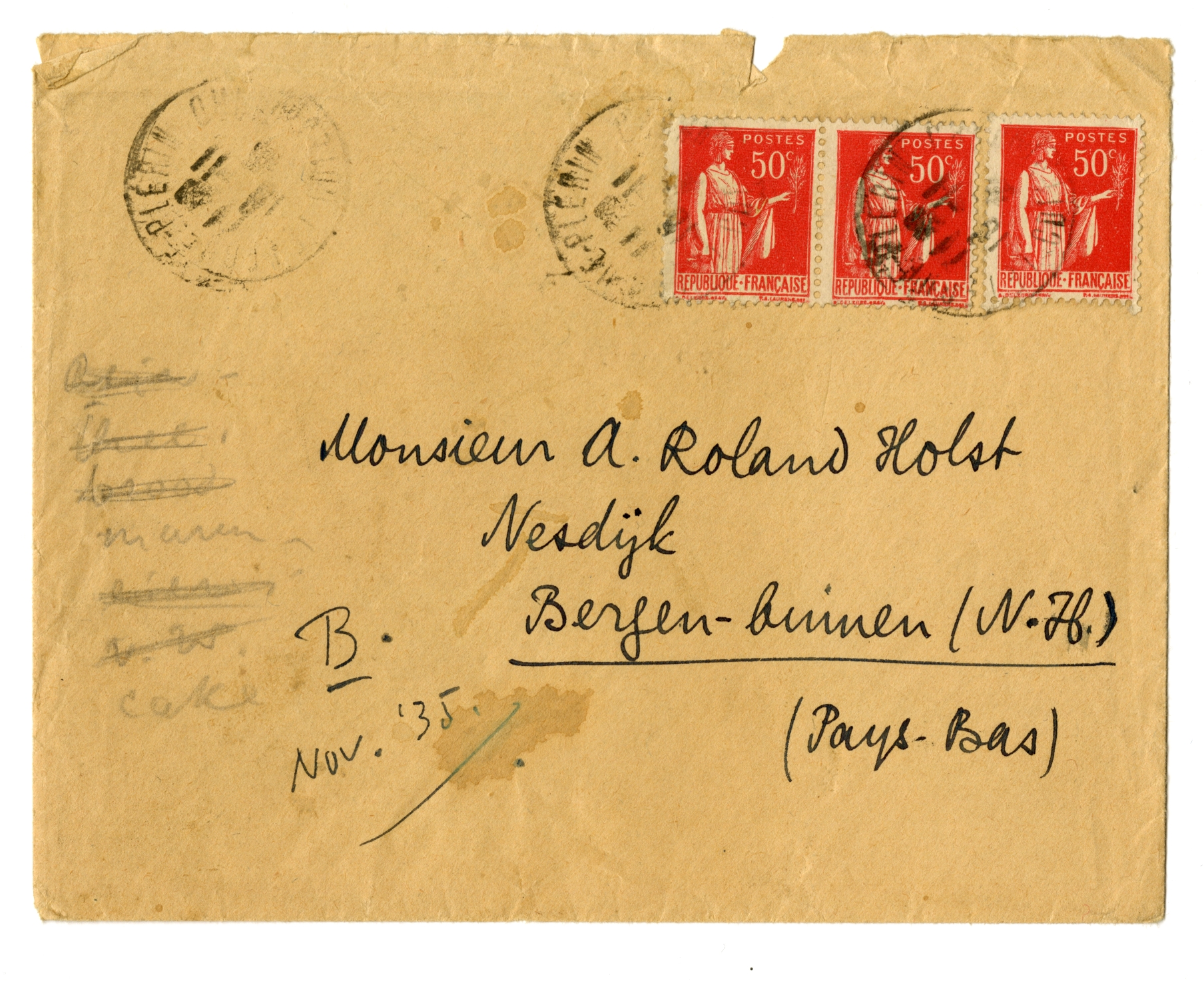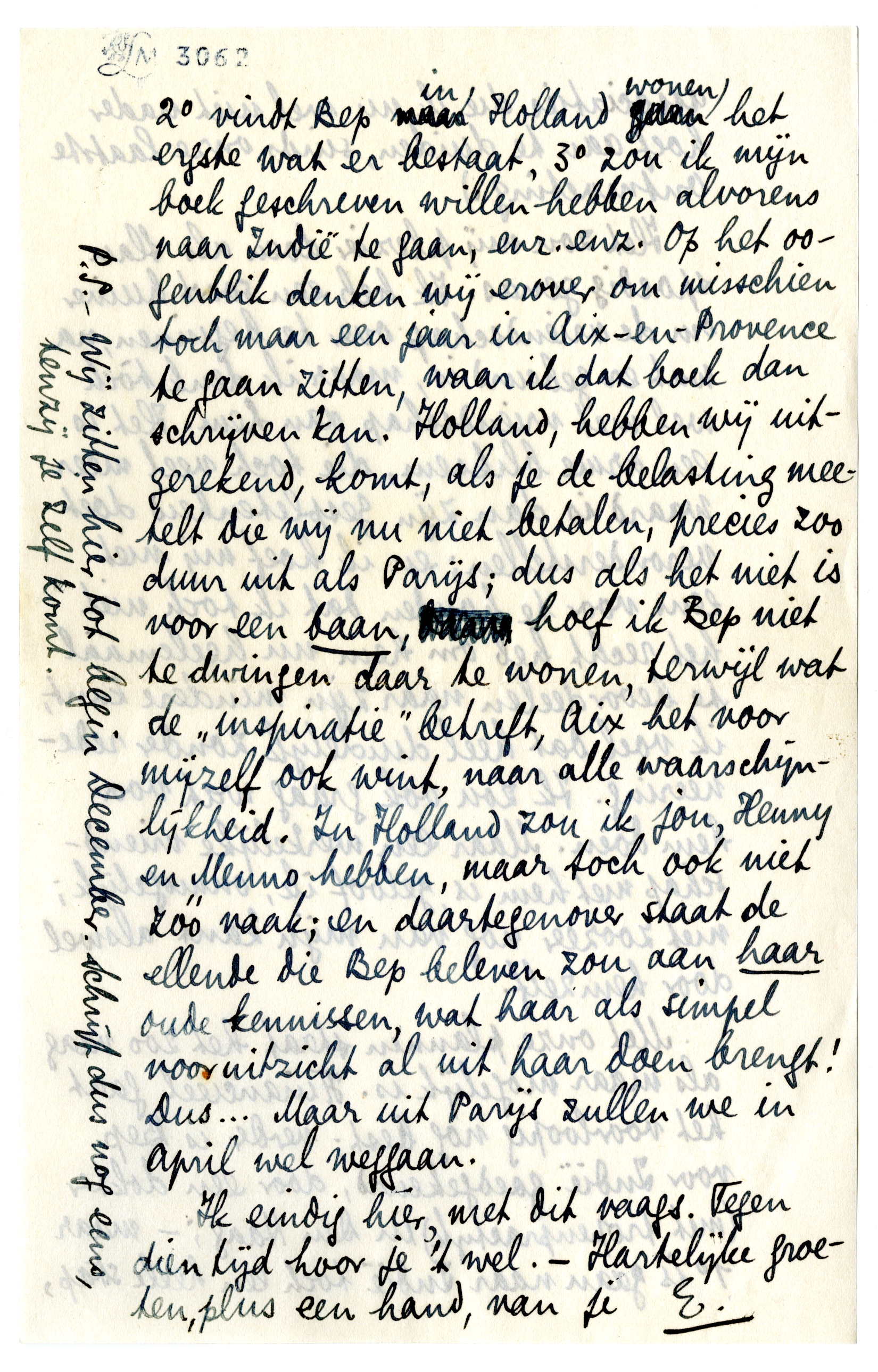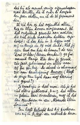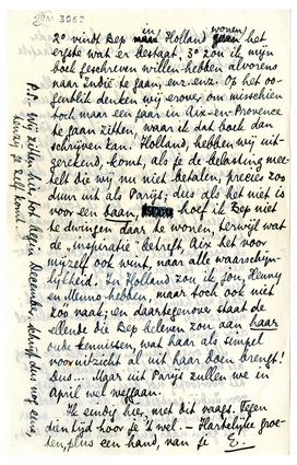 Met onze plannen staat het zoo vaag als maar mogelijk is. Financieel gaat het voorloopig nog best; verder is Bep voor Indië goedgekeurd, door een dokter (met tropenpractijk) in Den Haag; - maar 1o is gaan naar Indië toch een heele stap, 2o vindt Bep in Holland wonen het ergste wat er bestaat, 3o zou ik mijn boek geschreven willen hebben alvorens naar Indië te gaan, enz. enz. Op het oogenblik denken wij erover om misschien toch maar een jaar in Aix-en-Provence te gaan zitten, waar ik dat boek dan schrijven kan. Holland, hebben wij uitgerekend, komt, als je de belasting meetelt die wij nu niet betalen, precies zoo duur uit als Parijs; dus als het niet is voor een baan, hoef ik Bep niet te dwingen daar te wonen, terwijl wat de ‘inspiratie’ betreft, Aix het voor mijzelf ook wint, naar alle waarschijnlijkheid. In Holland zou ik jou, Henny en Menno hebben, maar toch ook niet zóó vaak; en daartegenover staat de ellende die Bep beleven zou aan haar oude kennissen, wat haar als simpel vooruitzicht al uit haar doen brengt! Dus... Maar uit Parijs zullen we in April wel weggaan.