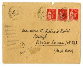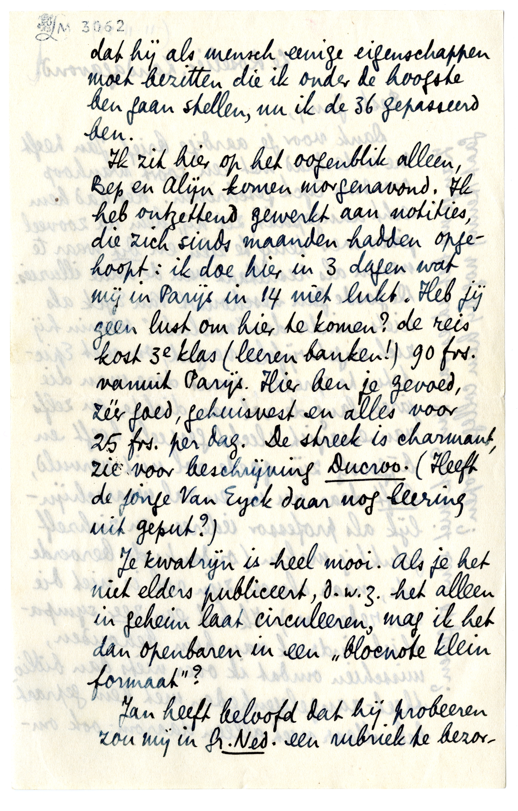 Ik zit hier op het oogenblik alleen, Bep en Alijn komen morgenavond. Ik heb ontzettend gewerkt aan notities, die zich sinds maanden hadden opgehoopt: ik doe hier in 3 dagen wat mij in Parijs in 14 niet lukt. Heb jij geen lust om hier te komen? de reis kost 3e klas (leeren banken!) 90 frs. vanuit Parijs. Hier ben je gevoed, zéér goed, gehuisvest en alles voor 25 frs. per dag. De streek is charmant, zie voor beschrijving Ducroo.3932 (Heeft de jonge Van Eyck daar nog leering uit geput?)