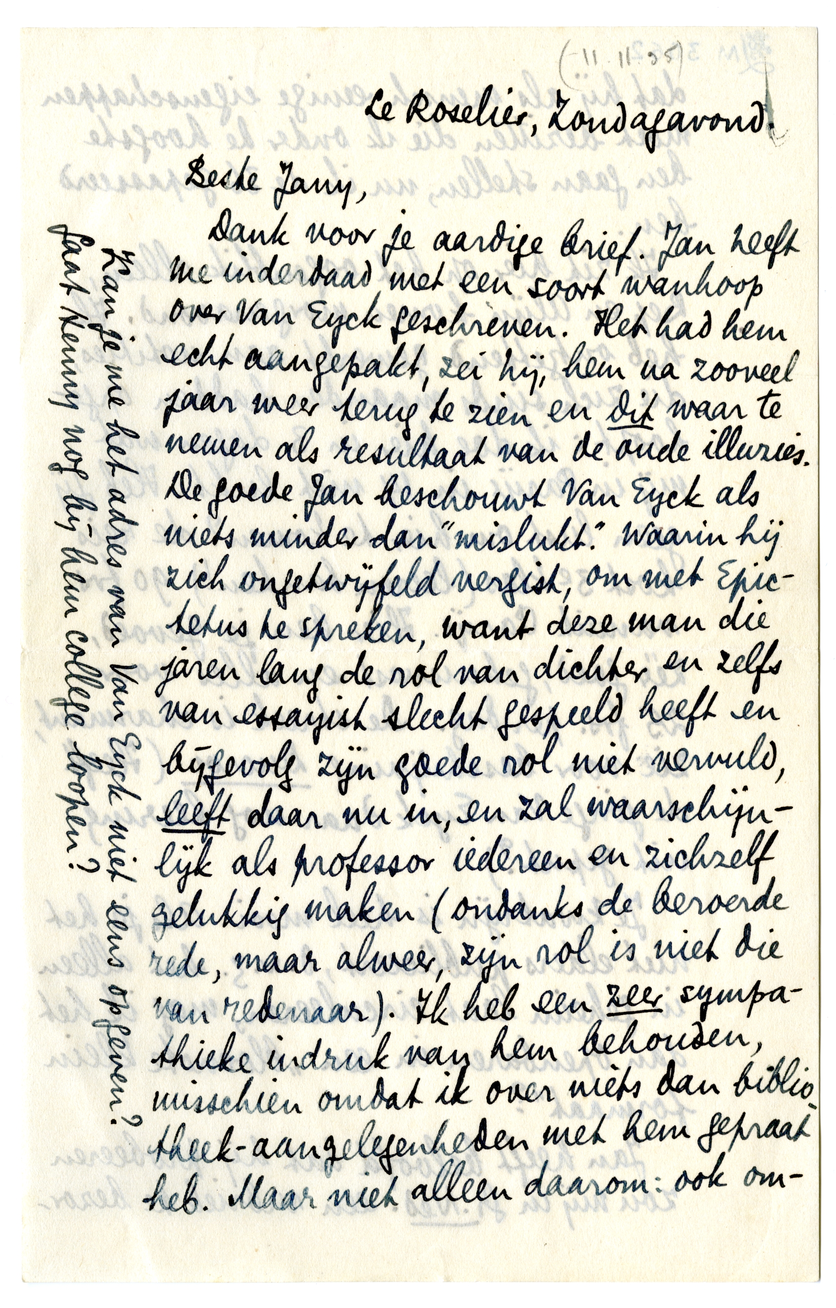 Dank voor je aardige brief. Jan heeft me inderdaad met een soort wanhoop over Van Eyck geschreven. Het had hem echt aangepakt, zei hij, hem na zooveel jaar weer terug te zien en dit waar te nemen als resultaat van de oude illuzies. De goede Jan beschouwt Van Eyck als niets minder dan ‘mislukt’. Waarin hij zich ongetwijfeld vergist, om met Epictetus te spreken, want deze man die jaren lang de rol van dichter en zelfs van essayist slecht gespeeld heeft en bijgevolg zijn goede rol niet vervuld, leeft daar nu in, en zal waarschijnlijk als professor iedereen en zichzelf gelukkig maken (ondanks de beroerde rede, maar alweer, zijn rol is niet die van redenaar). Ik heb een zeer sympathieke indruk van hem behouden, misschien omdat ik over niets dan bibliotheek-aangelegenheden met hem gepraat heb. Maar niet alleen daarom: ook omdat hij als mensch eenige eigenschappen moet bezitten die ik onder de hoogste ben gaan stellen, nu ik de 36 gepasseerd ben.