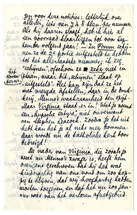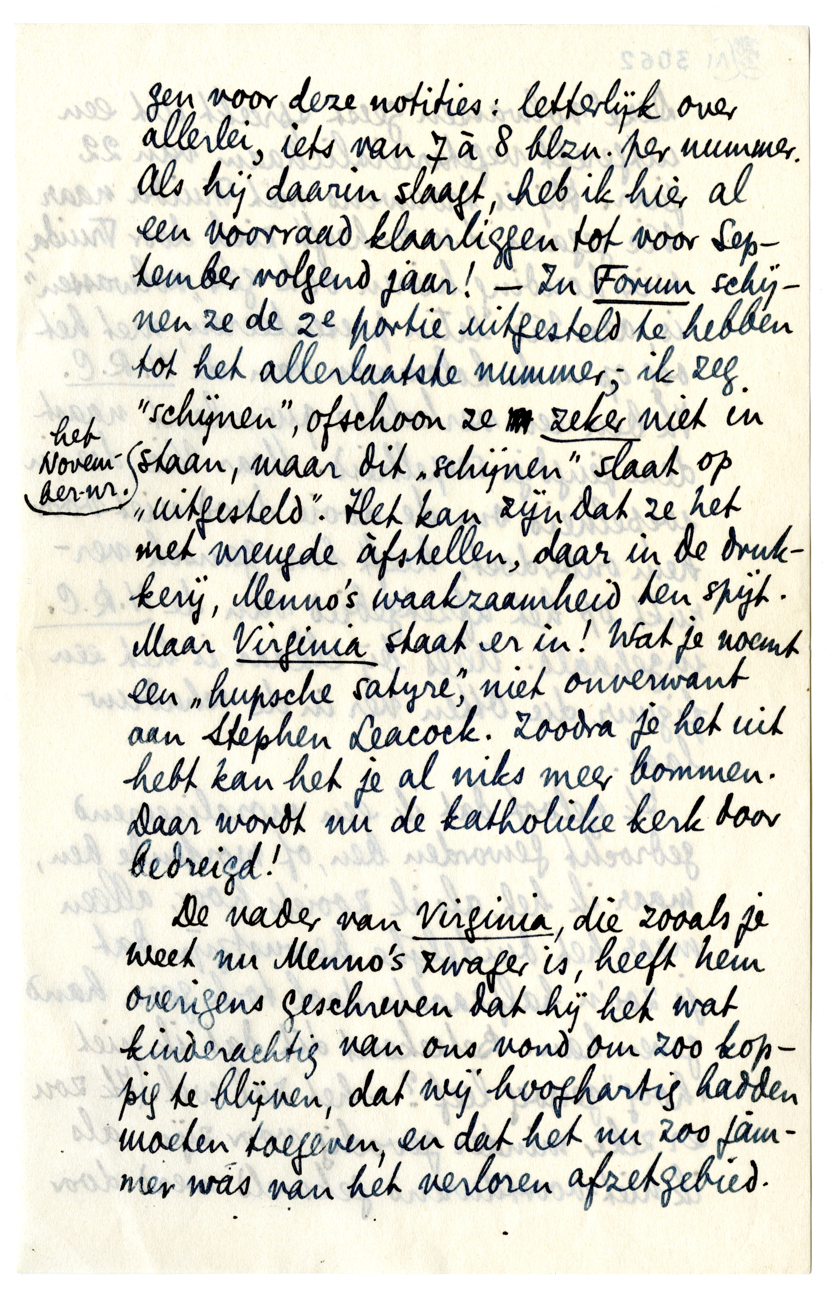 Jan heeft beloofd dat hij probeeren zou mij in Gr. Ned. een rubriek te bezorgen voor deze notities: letterlijk over allerlei, iets van 7 à 8 blzn. per nummer. Als hij daarin slaagt, heb ik hier al een voorraad klaarliggen tot voor September volgend jaar! - In Forum schijnen ze de 2e portie uitgesteld te hebben tot het allerlaatste nummer; ik zeg ‘schijnen’, ofschoon ze zeker niet in het November-nr. staan, maar dit ‘schijnen’ slaat op ‘uitgesteld’. Het kan zijn dat ze het met vreugde àfstellen, daar in de drukkerij, Menno's waakzaamheid ten spijt. Maar Virginia staat er in! Wat je noemt een ‘hupsche satyre’, niet onverwant aan Stephen Leacock.3934 Zoodra je het uit hebt kan het je al niks meer bommen. Daar wordt nu de katholieke kerk door bedreigd!