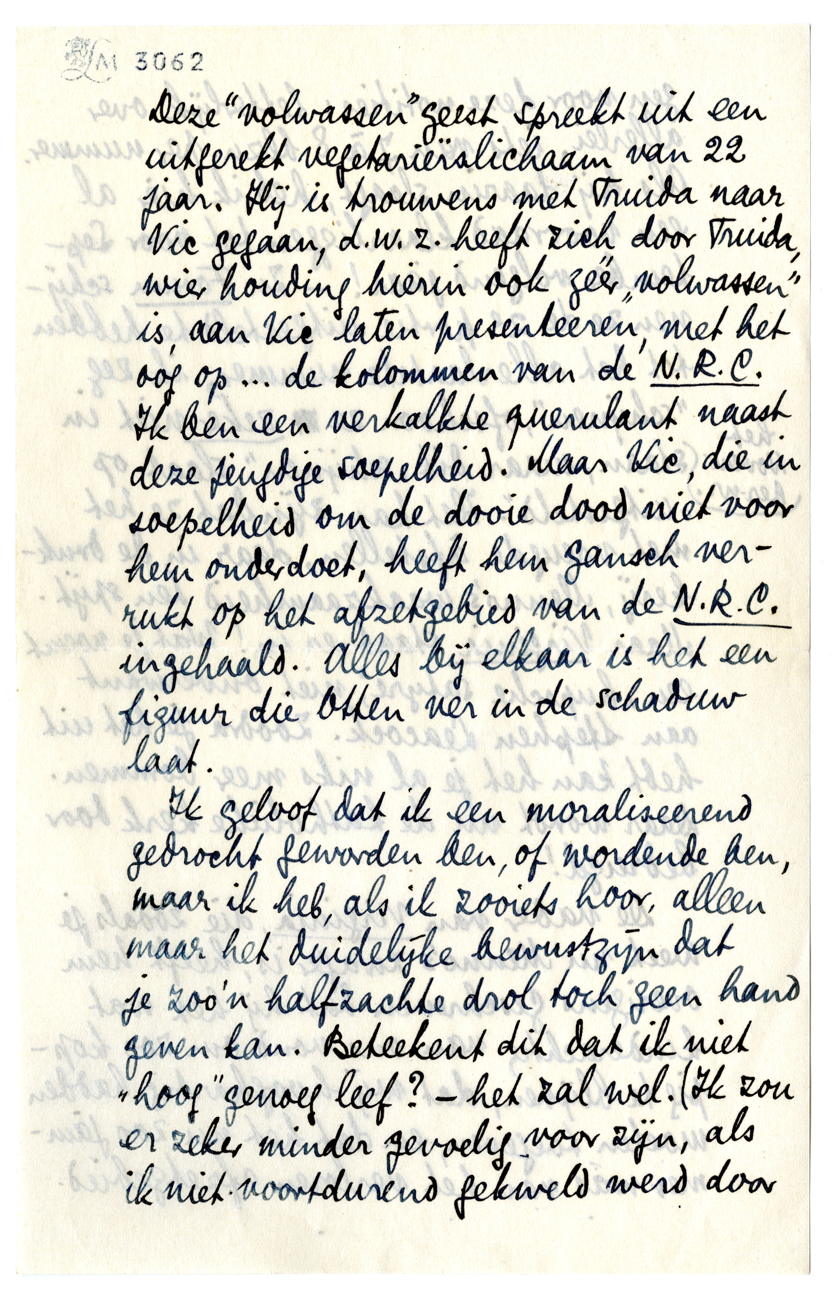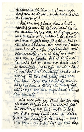 Ik geloof dat ik een moraliseerend gedrocht geworden ben, of wordende ben, maar ik heb, als ik zooiets hoor, alleen maar het duidelijke bewustzijn dat je zoo'n halfzachte drol toch geen hand geven kan. Beteekent dit dat ik niet ‘hoog’ genoeg leef? - het zal wel. (Ik zou er zeker minder gevoelig voor zijn, als ik niet voortdurend gekweld werd door associaties die ik nu wel niet nader hoef aan te duiden, sinds onze laatste ontmoeting.)