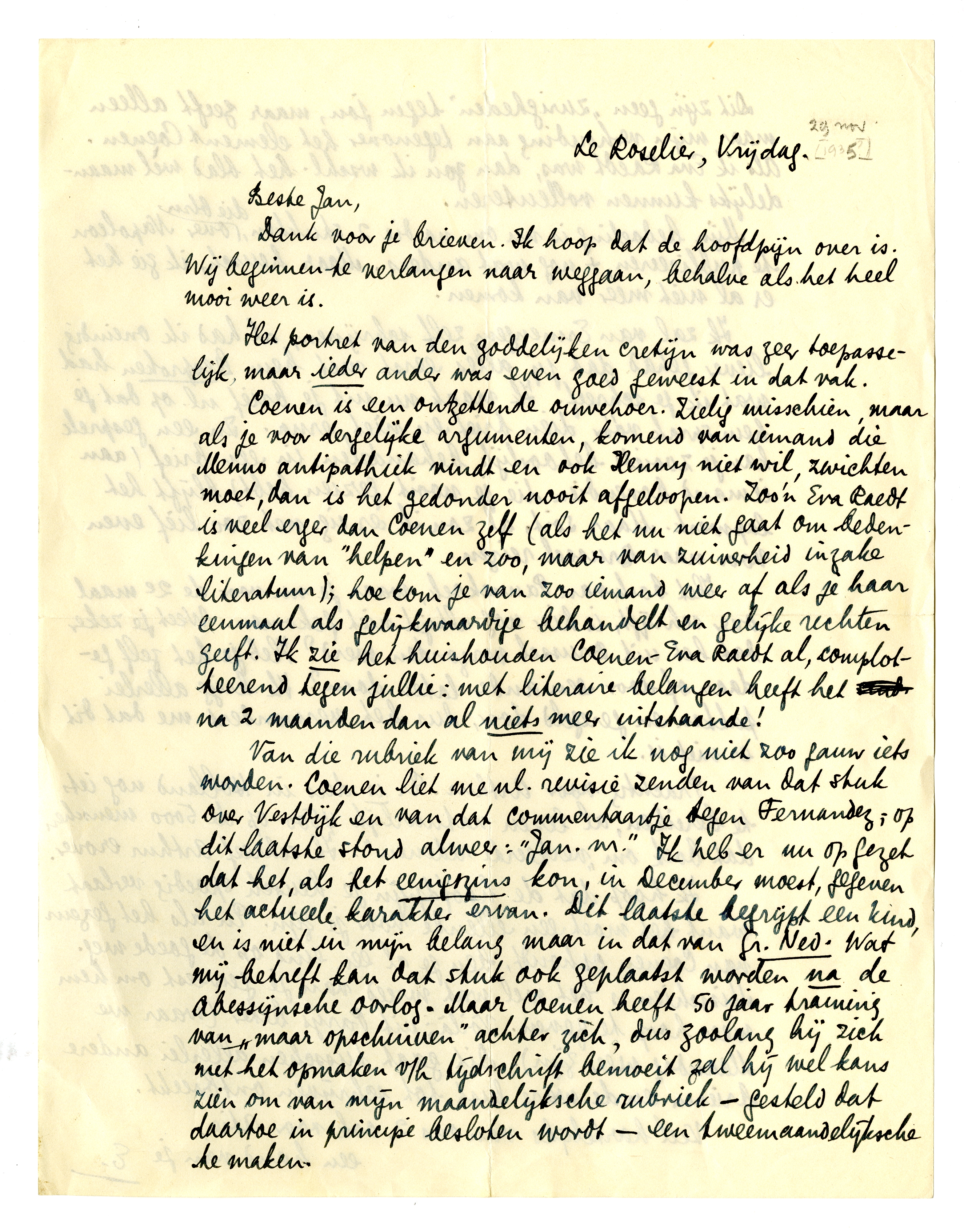Van die rubriek van mij zie ik nog niet zoo gauw iets worden. Coenen liet me nl. revisie zenden van dat stuk over Vestdijk en van dat commentaartje tegen Fernandez; op dit laatste stond alweer: ‘Jan. nr.’ Ik heb er nu op gezet dat het, als het eenigszins kon, in December moest, gegeven het actueele karakter ervan. Dit laatste begrijpt een kind, en is niet in mijn belang maar in dat van Gr. Ned. Wat mij betreft kan dat stuk ook geplaatst worden na de Abessijnsche oorlog. Maar Coenen heeft 50 jaar training van ‘maar opschuiven’ achter zich, dus zoolang hij zich met het opmaken v/h tijdschrift bemoeit zal hij wel kans zien om van mijn maandelijksche rubriek - gesteld dat daartoe in principe besloten wordt - een tweemaandelijksche te maken.