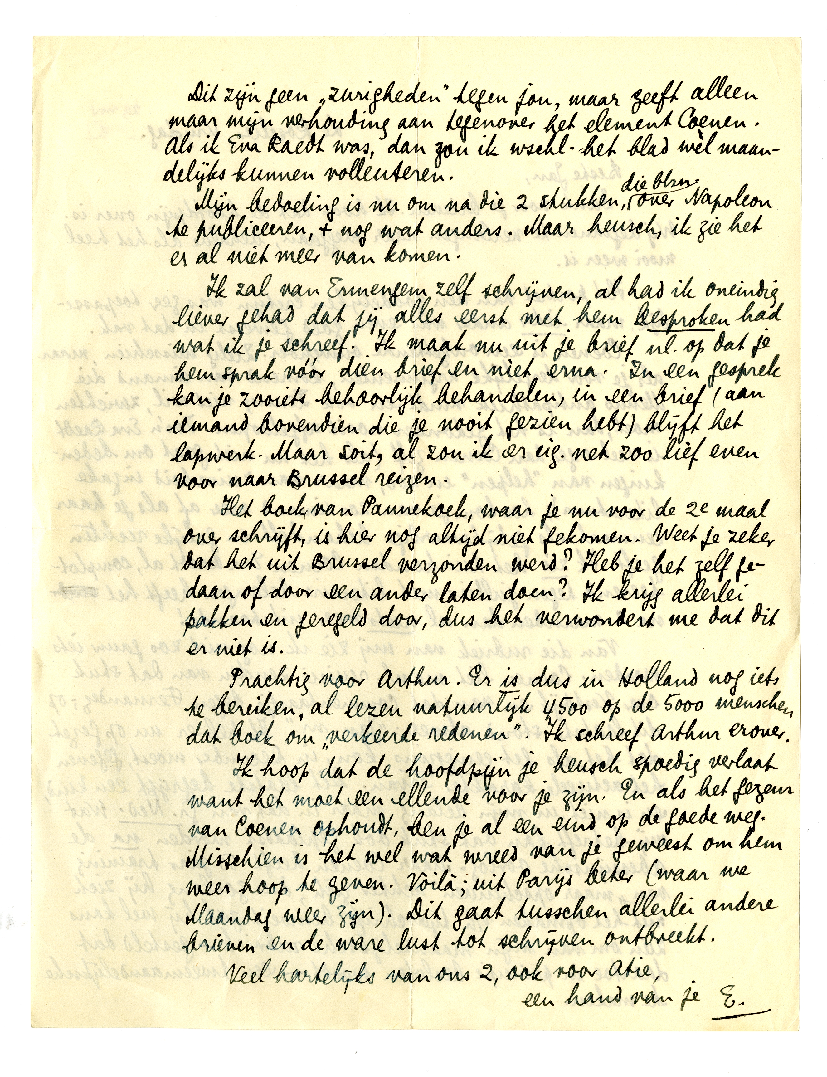 Ik hoop dat de hoofdpijn je heusch spoedig verlaat want het moet een ellende voor je zijn. En als het gezeur van Coenen ophoudt, ben je al een eind op de goede weg. Misschien is het wel wat wreed van je geweest om hem weer hoop te geven. Voilà; uit Parijs beter (waar we Maandag weer zijn). Dit gaat tusschen allerlei andere brieven en de ware lust tot schrijven ontbreekt.