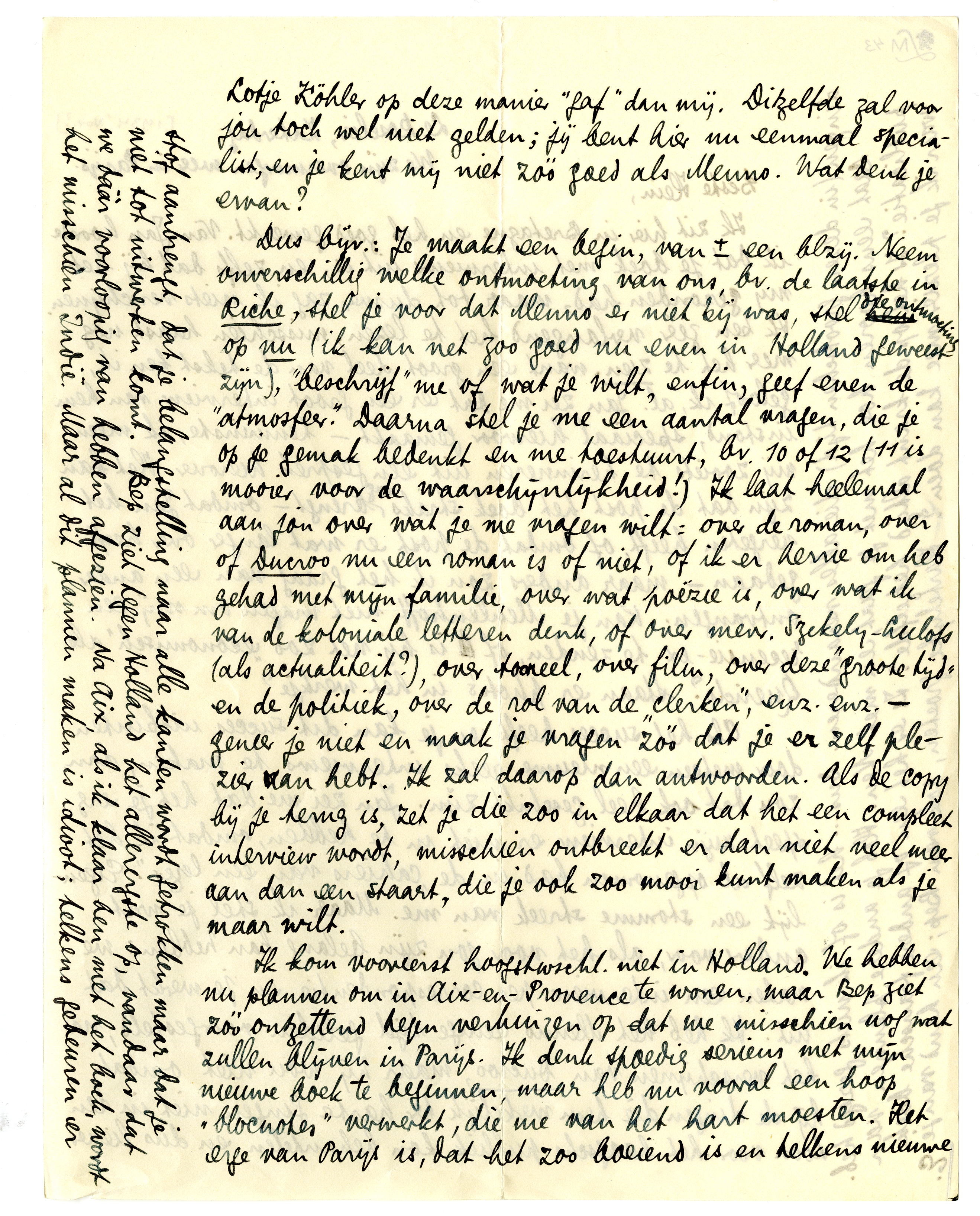 Als het succes heeft en je kan dit succes uitbuiten door meteen een nieuwe reeks interviews te maken, dan zou dat ook heel geschikt zijn. Jan zei me dat het je erg speet mijn interview er niet in te hebben, omdat ik het zelf al opgenomen had in de ‘cahiers van een lezer’.3958 Eigenlijk een stomme streek van me. Maar ik stel je wat anders voor, als het voor jou zijn belang kan hebben: we maken een interview per correspondentie en je werkt dat uit. Ik heb het Menno eenige tijd geleden voorgesteld, na het verschijnen van Ducroo, maar hij wou niet omdat hij de dingen die hem werkelijk ter harte gingen niet in den toon van het haagsche publiek kon behandelen en dus liever Lotje Köhler op deze manier ‘gaf’ dan mij.3959 Ditzelfde zal voor jou toch wel niet gelden; jij bent hier nu eenmaal specialist, en je kent mij niet zóó goed als Menno. Wat denk je ervan?3960