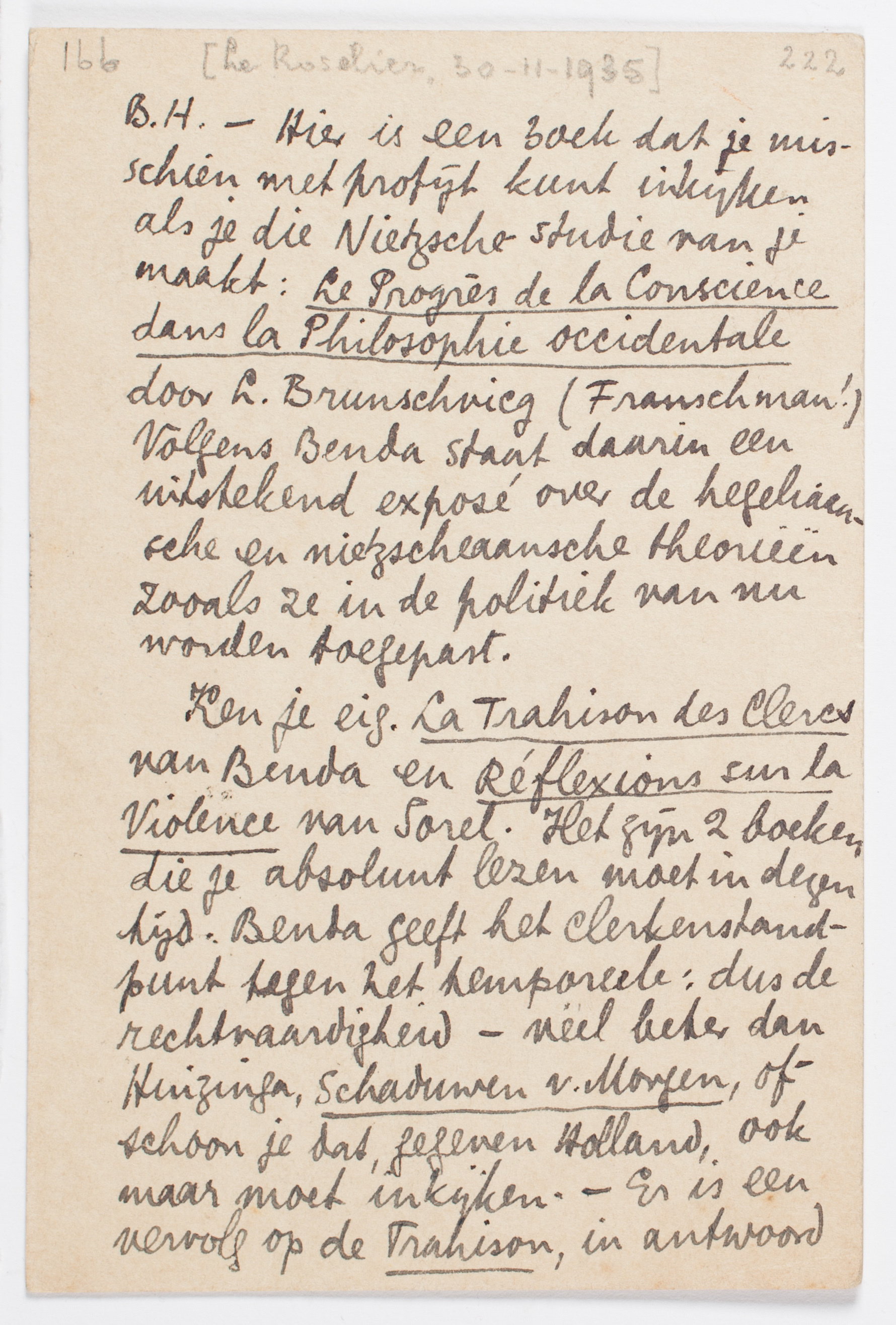 B.H. - Hier is een boek dat je misschien met profijt kunt inkijken als je die Nietzsche-studie van je maakt: Le Progrès de la Conscience dans la Philosophie occidentale door L. Brunschvicg (Franschman!) Volgens Benda staat daarin een uitstekend exposé over de hegeliaansche en nietzscheaansche theorieën zooals ze in de politiek van nu worden toegepast.