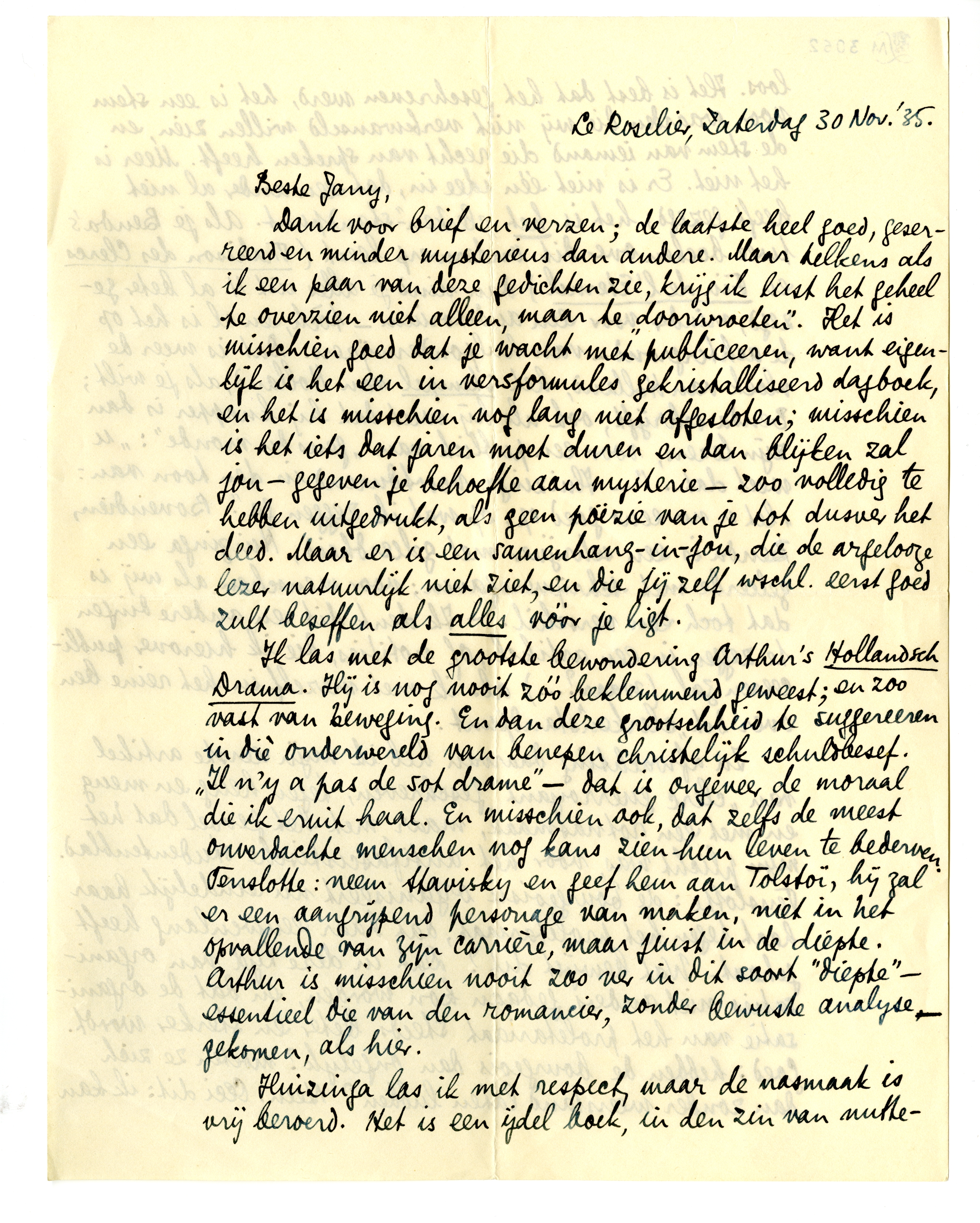 Ik las met de grootste bewondering Arthur's Hollandsch Drama. Hij is nog nooit zóó beklemmend geweest; en zoo vast van beweging. En dan deze grootschheid te suggereeren in diè onderwereld van benepen christelijk schuldbesef. ‘Il n'y a pas de sot drame’ - dat is ongeveer de moraal die ik eruit haal. En misschien ook, dat zelfs de meest onverdachte menschen nog kans zien hun leven te bederven. Tenslotte: neem Stavisky en geef hem aan Tolstoï, hij zal er een aangrijpend personage van maken, niet in het opvallende van zijn carrière, maar juist in de diepte. Arthur is misschien nooit zoo ver in dit soort ‘diepte’ - essentieel die van den romancier, zonder bewuste analyse - gekomen, als hier.