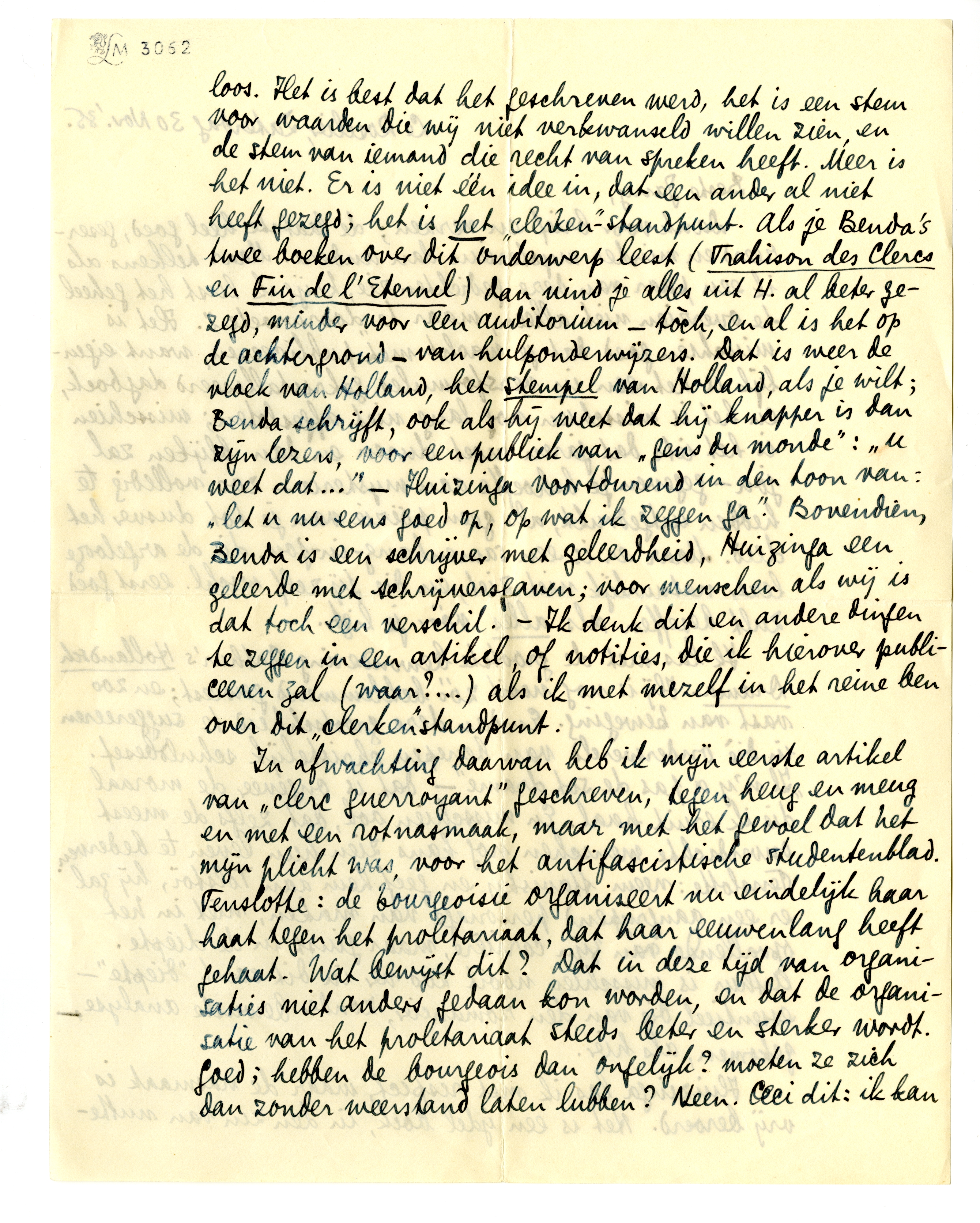 Huizinga las ik met respect, maar de nasmaak is vrij beroerd. Het is een ijdel boek, in den zin van nutteloos. Het is best dat het geschreven werd, het is een stem voor waarden die wij niet verkwanseld willen zien, en de stem van iemand die recht van spreken heeft. Meer is het niet. Er is niet één idee in, dat een ander al niet heeft gezegd; het is het ‘clerken’-standpunt. Als je Benda's twee boeken over dit onderwerp leest (Trahison des Clercs en l'Eternel) dan vind je alles uit H. al beter gezegd, minder voor een auditorium - tòch, en al is het op de achtergrond - van hulponderwijzers. Dat is weer de vloek van Holland, het stempel van Holland, als je wilt; Benda schrijft, ook als hij weet dat hij knapper is dan zijn lezers, voor een publiek van ‘gens du monde’: ‘u weet dat...’ - Huizinga voortdurend in den toon van: ‘let u nu eens goed op, op wat ik zeggen ga’. Bovendien, Benda is een schrijver met geleerdheid, Huizinga een geleerde met schrijvers-gaven; voor menschen als wij is dat toch een verschil. - Ik denk dit en andere dingen te zeggen in een artikel, of notities,3962 die ik hierover publiceeren zal (waar?...) als ik met mezelf in het reine ben over dit ‘clerken’ standpunt.