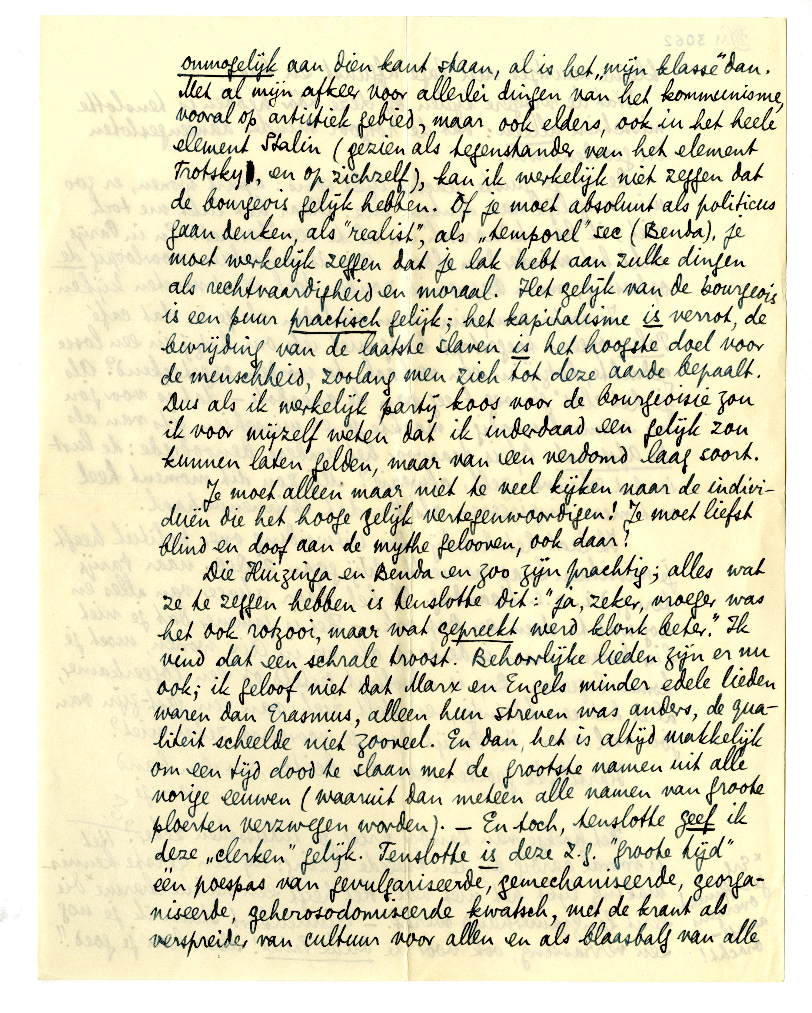 In afwachting daarvan heb ik mijn eerste artikel van ‘clerc guerroyant’ geschreven, tegen heug en meug en met een rot nasmaak, maar met het gevoel dat het mijn plicht was, voor het antifascistische studentenblad. Tenslotte: de bourgeoisie organiseert nu eindelijk haar haat tegen het proletariaat, dat haar eeuwenlang heeft gehaat. Wat bewijst dit? Dat in deze tijd van organisaties niet anders gedaan kon worden, en dat de organisatie van het proletariaat steeds beter en sterker wordt. Goed; hebben de bourgeois dan ongelijk? moeten ze zich dan zonder weerstand laten lubben? Neen. Ceci dit: ik kan onmogelijk aan dien kant staan, al is het ‘mijn klasse’ dan. Met al mijn afkeer voor allerlei dingen van het kommunisme, vooral op artistiek gebied, maar ook elders, ook in het heele element Stalin (gezien als tegenstander van het element Trotsky, en op zichzelf), kan ik werkelijk niet zeggen dat de bourgeois gelijk hebben. Of je moet absoluut als politicus gaan denken, als ‘realist’, als ‘temporel’ sec (Benda), je moet werkelijk zeggen dat je lak hebt aan zulke dingen als rechtvaardigheid en moraal. Het gelijk van de bourgeois is een puur practisch gelijk; het kapitalisme is verrot, de bevrijding van de laatste slaven is het hoogste doel voor de menschheid, zoolang men zich tot deze aarde bepaalt. Dus als ik werkelijk partij koos voor de bourgeoisie zou ik voor mijzelf weten dat ik inderdaad een gelijk zou kunnen laten gelden, maar van een verdomd laag soort.