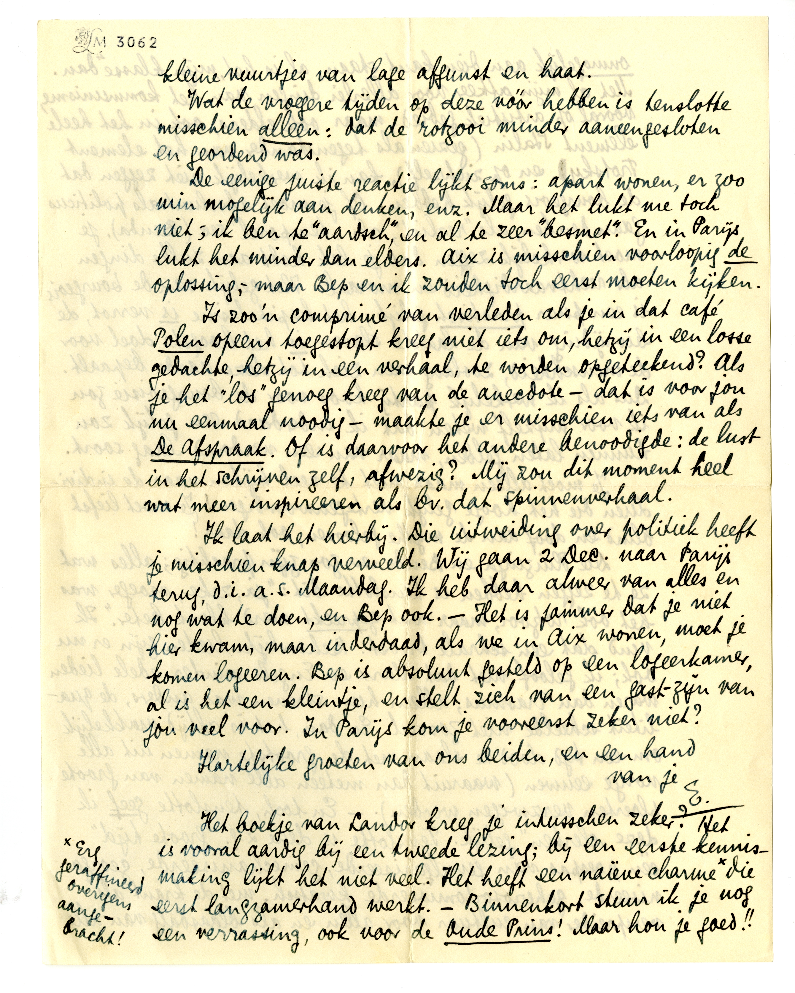 Ik laat het hierbij. Die uitweiding over politiek heeft je misschien knap verveeld. Wij gaan 2 Dec. naar Parijs terug, d.i.a.s. Maandag. Ik heb daar alweer van alles en nog wat te doen, en Bep ook. - Het is jammer dat je niet hier kwam, maar inderdaad, als we in Aix wonen, moet je komen logeeren. Bep is absoluut gesteld op een logeerka-mer, al is het een kleintje, en stelt zich van een gast-zijn van jou veel voor. In Parijs kom je vooreerst zeker niet?