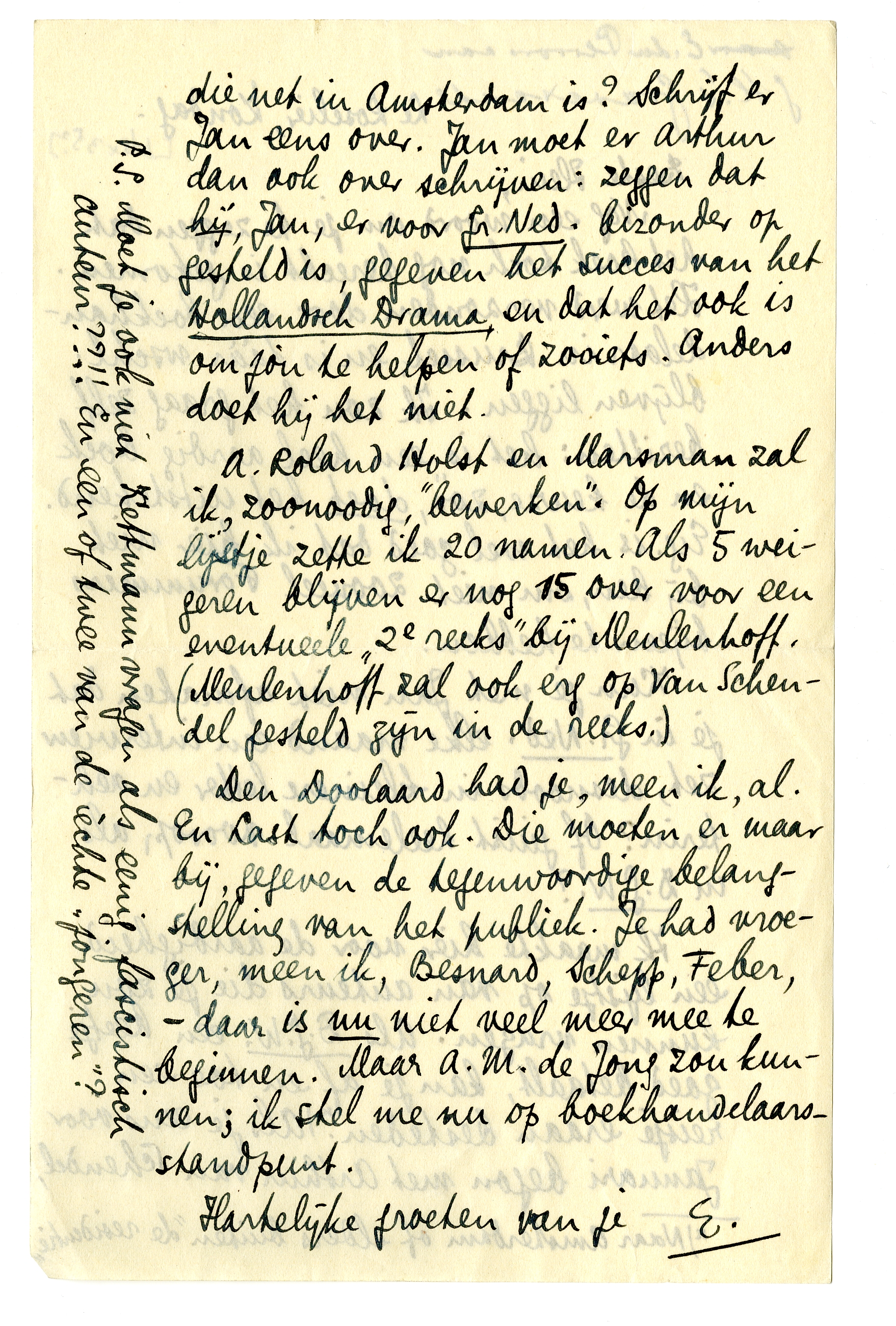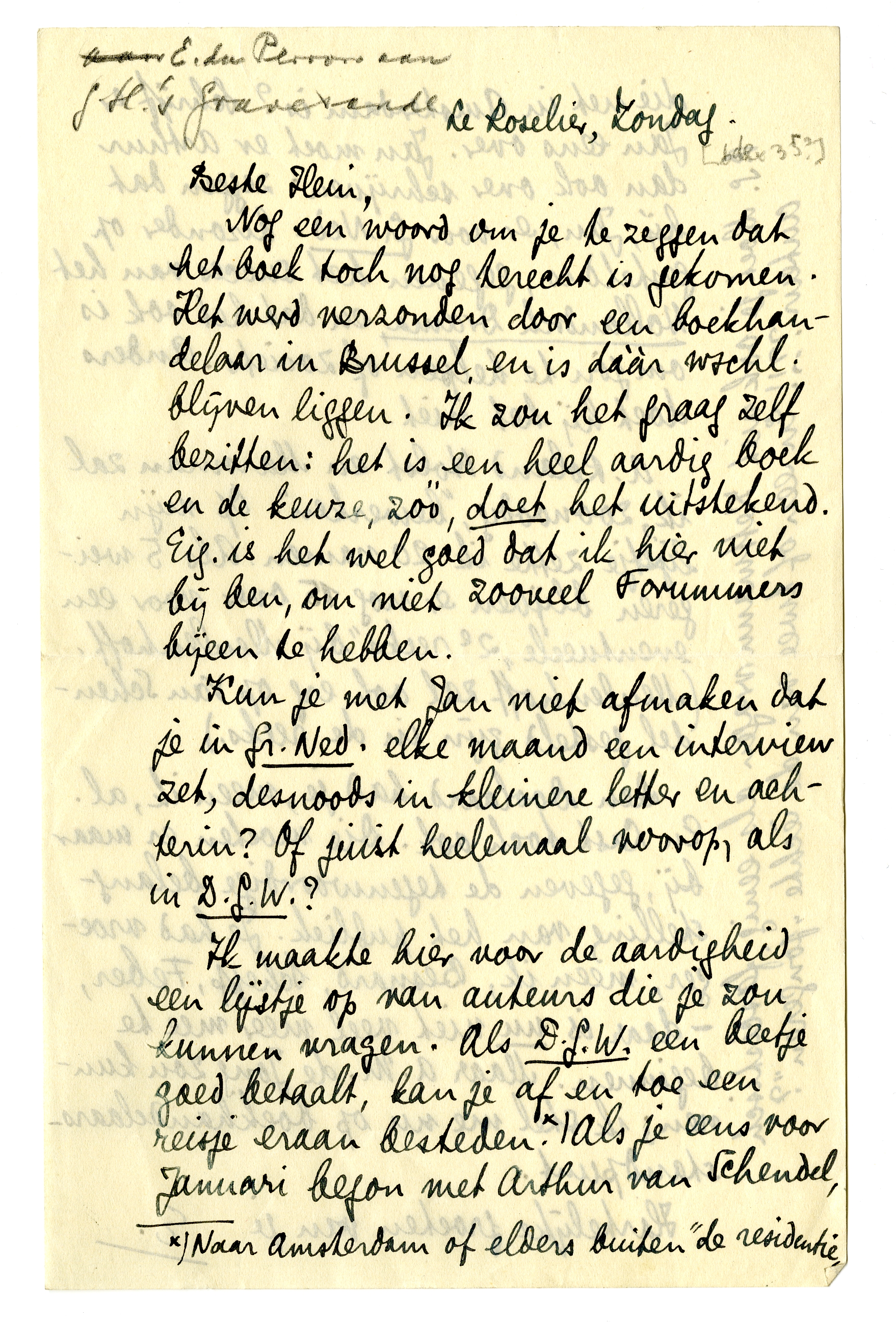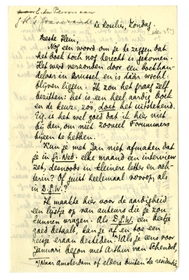 Ik maakte hier voor de aardigheid een lijstje op van auteurs die je zou kunnen vragen. Als D.G.W. een beetje goed betaalt, kan je af en toe een reisje eraan besteden3966. Als je eens voor Januari begon met Arthur van Schendel, die net in Amsterdam is? Schrijf er Jan eens over. Jan moet er Arthur dan ook over schrijven: zeggen dat hij, Jan, er voor Gr. Ned. bizonder op gesteld is, gegeven het succes van het Hollandsch Drama, en dat het ook is om jou te helpen of zooiets. Anders doet hij het niet.