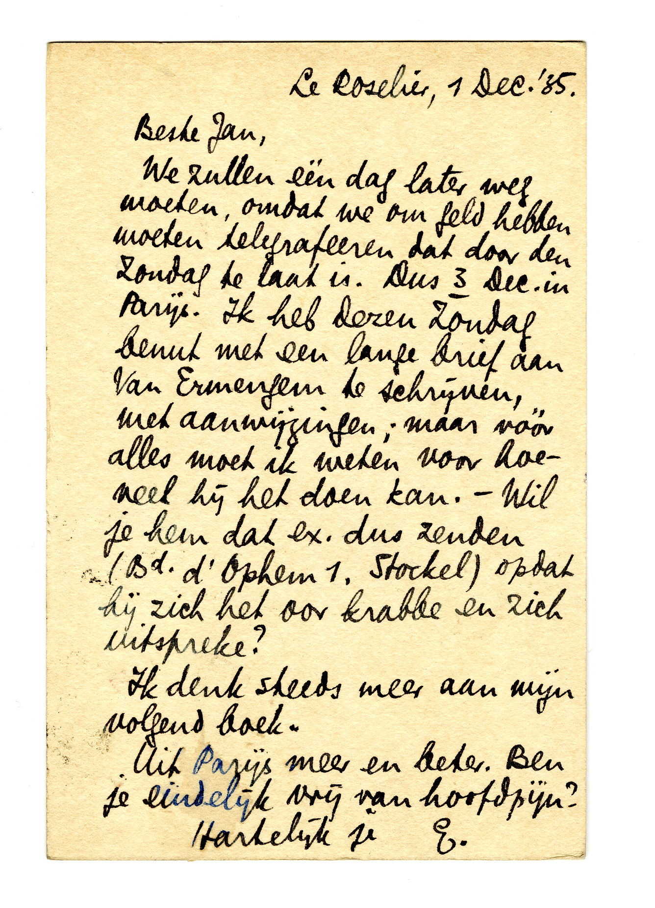 We zullen één dag later weg moeten, omdat we om geld hebben moeten telegrafeeren dat door den Zondag te laat is. Dus 3 Dec. in Parijs. Ik heb dezen Zondag benut met een lange brief aan Van Ermengem te schrijven, met aanwijzingen; maar vóór alles moet ik weten voor hoeveel hij het doen kan. - Wil je hem dat ex. dus zenden (Bd. d'Ophem 1, Stockel) opdat hij zich het oor krabbe en zich uitspreke?