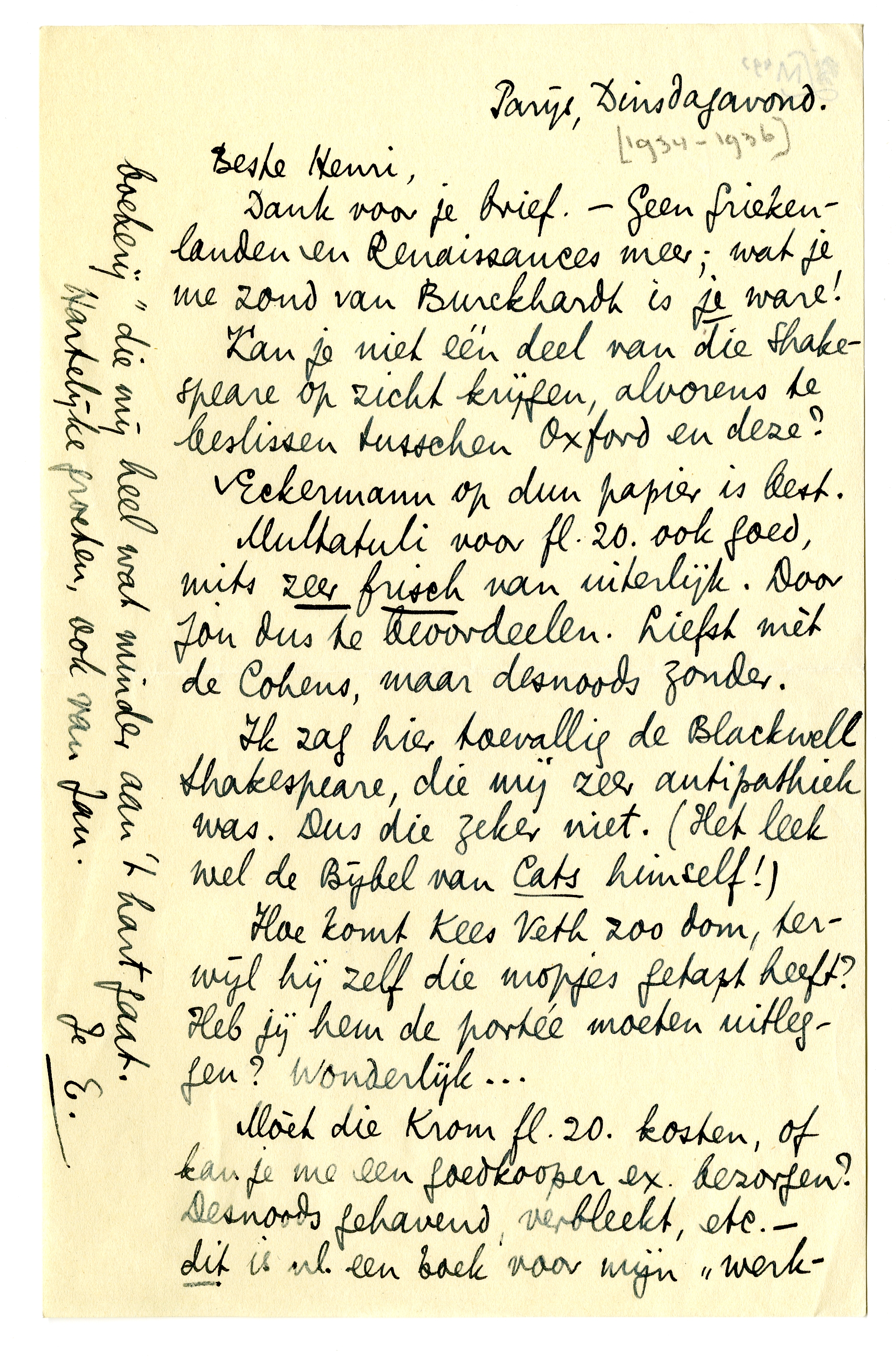 Moèt die Krom fl. 20. kosten, of kan je me een goedkooper ex. bezorgen? Desnoods gehavend, verbleekt, etc. - dit is nl. een boek voor mijn ‘werkboekerij’ die mij heel wat minder aan 't hart gaat.