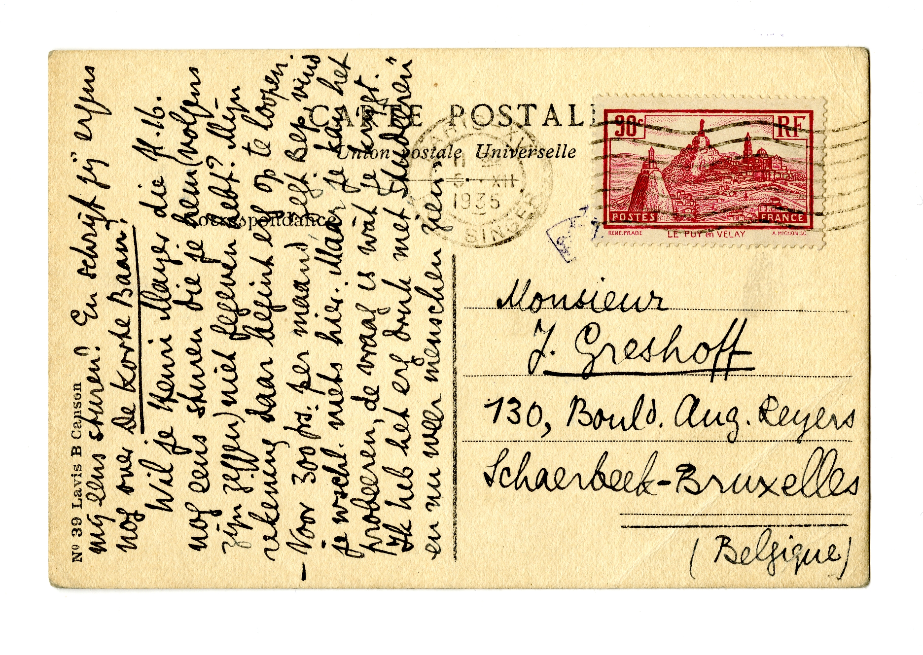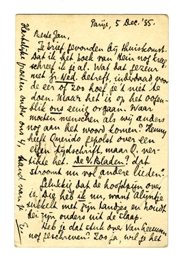 Wil je Henri Mayer die fl. 16. nog eens sturen die je hem (volgens zijn zeggen) niet gegeven hebt? Mijn rekening daar begint erg op te loopen. - Voor 300 frs. per maand zegt Bep, vind je wschl. niets hier. Maar je kan het probeeren, de vraag is wàt je krijgt. Ik heb het erg druk met ‘studeeren’ en nu weer menschen zien.