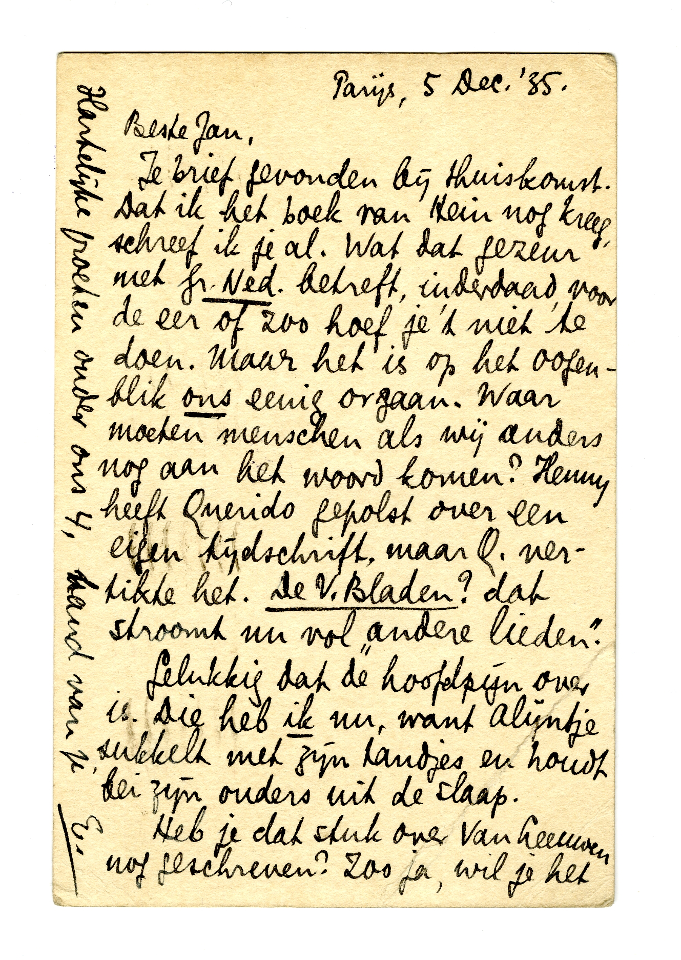 Je brief gevonden bij thuiskomst. Dat ik het boek van Hein nog kreeg schreef ik je al. Wat dat gezeur met Gr. Ned. betreft, inderdaad voor de eer of zoo hoef je 't niet te doen. Maar het is op het oogenblik ons eenig orgaan. Waar moeten menschen als wij anders nog aan het woord komen? Henny heeft Querido gepolst over een eigen tijdschrift, maar Q. vertikte het. De V. Bladen? dat stroomt nu vol ‘andere lieden’.