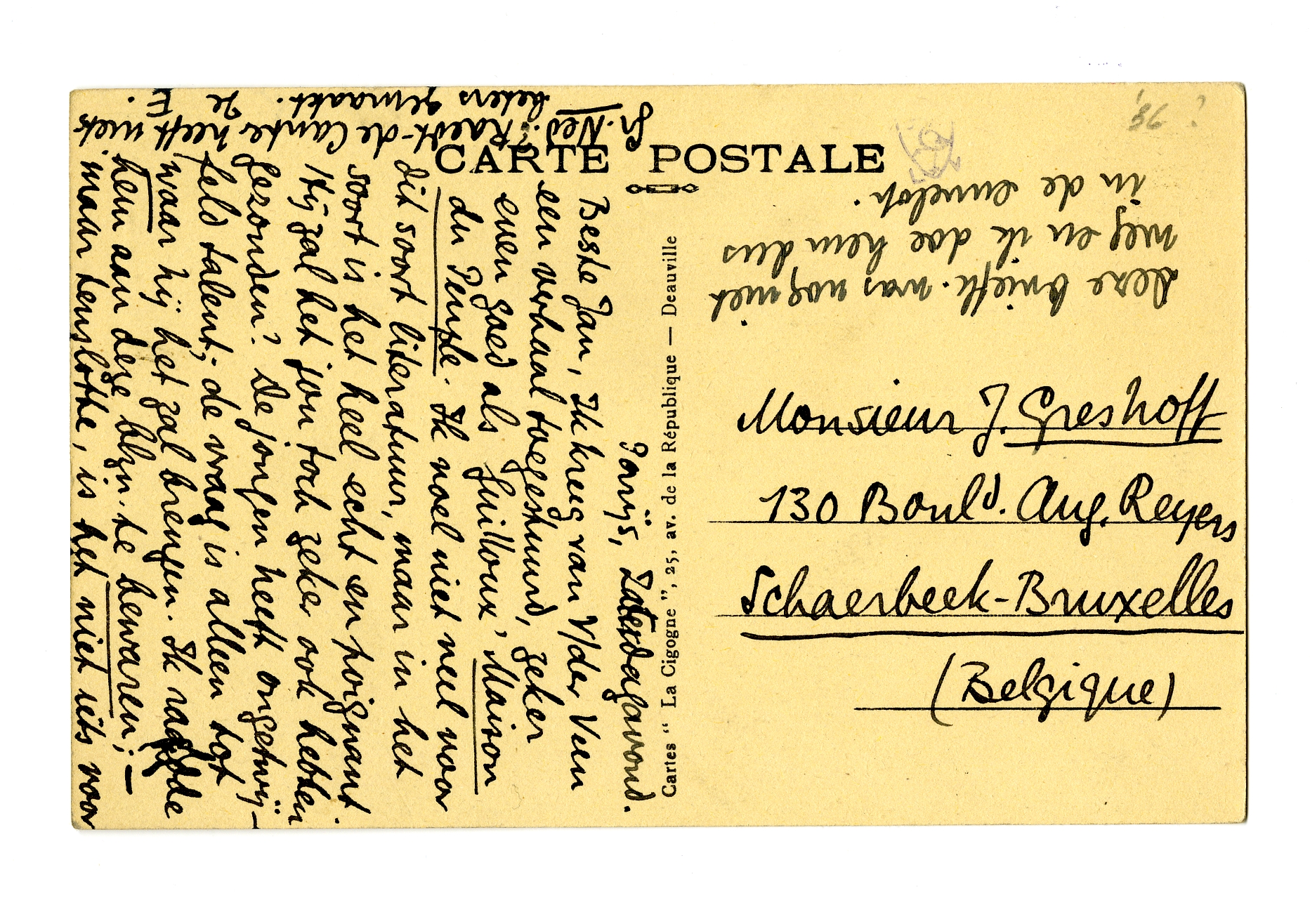 Beste Jan, Ik kreeg van V/der Veen een verhaal toegestuurd, zeker even goed als Guilloux' Maison du Peuple. Ik voel niet veel voor dit soort literatuur, maar in het soort is het heel echt en poignant. Hij zal het jou toch zeker ook hebben gezonden? De jongen heeft ongetwijfeld talent; de vraag is alleen tot waar hij het zal brengen. Ik raadde hem aan deze blzn. te bewaren; - maar tenslotte, is het niet iets voor Gr. Ned.? Raedt-de Canter heeft niets beters gemaakt.
