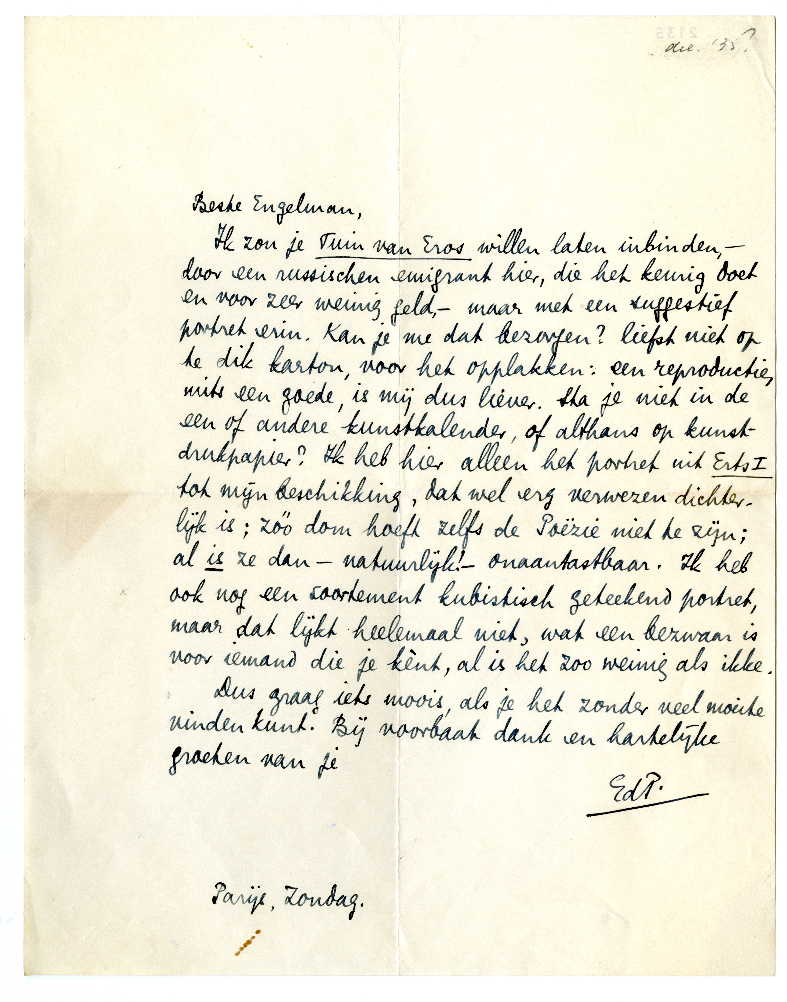 Ik zou je Tuin van Eros willen laten inbinden, - door een russischen emigrant hier, die het keurig doet en voor zeer weinig geld, - maar met een suggestief portret erin. Kan je me dat bezorgen? liefst niet op te dik karton, voor het opplakken: een reproductie, mits een goede, is mij dus liever. Sta je niet in de een of andere kunstkalender, of althans op kunstdrukpapier? Ik heb hier alleen het portret uit Erts I3984 tot mijn beschikking, dat wel erg verwezen dichterlijk is; zóó dom hoeft zelfs de Poëzie niet te zijn; al is ze dan - natuurlijk! - onaantastbaar. Ik heb ook nog een soortement kubistisch geteekend portret, maar dat lijkt heelemaal niet, wat een bezwaar is voor iemand die je kènt, al is het zoo weinig als ikke.