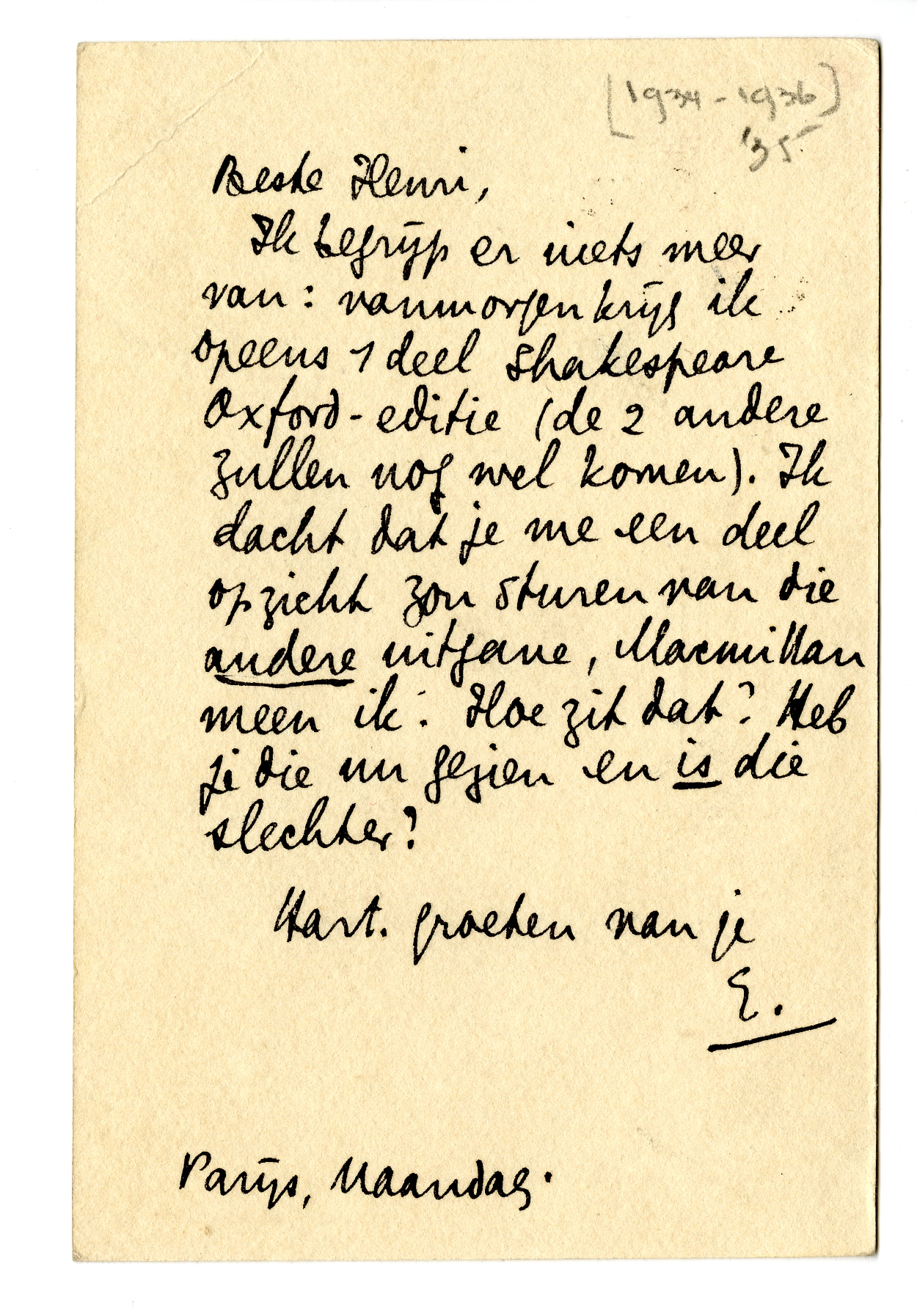 Ik begrijp er niets meer van: vanmorgen krijg ik opeens 1 deel Shakespeare Oxford-editie (de 2 andere zullen nog wel komen). Ik dacht dat je me een deel op zicht zou sturen van die andere uitgave, Macmillan meen ik. Hoe zit dat? Heb je die nu gezien en is die slechter?