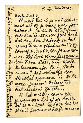 Ik merk dat ik je niet geantwoord heb op je vraag naar Jacquemont. Je vindt alle gegevens over hem in een zeer goed boek dat over hem bestaat, en dat wemelt van citaten uit zijn correspondentie, reisjournalen enz. Het heet Victor Jacquemont door Pierre Maes, uitg. Desclée De Brouwer etc. Paris. Verder is van J. dat verhaaltje door Stendhal opgenomen in De l'Amour, genaamd Félicie en onderteekend Goncelin.
