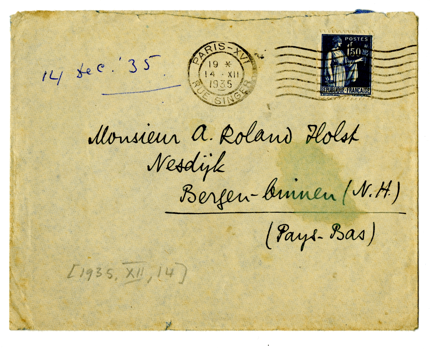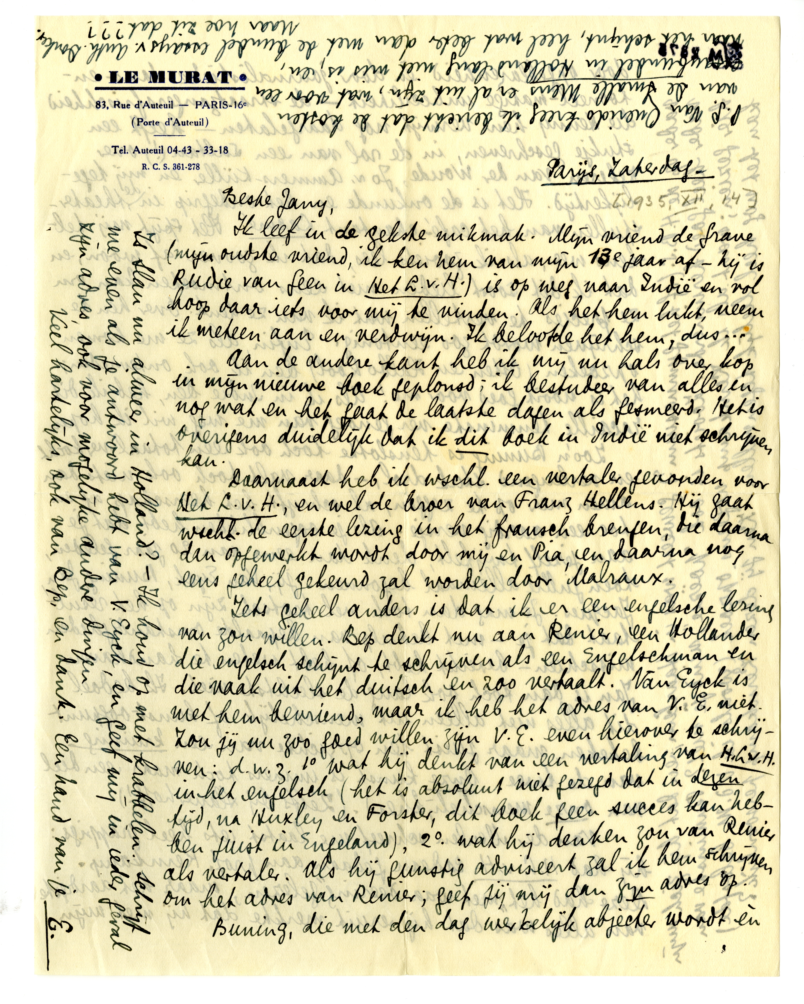 Iets geheel anders is dat ik er een engelsche lezing van zou willen. Bep denkt nu aan Renier,4004 een Hollander die engelsch schijnt te schrijven als een Engelschman en die vaak uit het duitsch en zoo vertaalt. Van Eyck is met hem bevriend, maar ik heb het adres van V.E. niet. Zou jij nu zoo goed willen zijn V.E. even hierover te schrijven: d.w.z. 1o wat hij denkt van een vertaling van H.L.v.H. in het engelsch (het is absoluut niet gezegd dat in dezen tijd, na Huxley en Forster, dit boek geen succes kan hebben juist in Engeland), 2o wat hij denken zou van Renier als vertaler. Als hij gunstig adviseert zal ik hem schrijven om het adres van Renier; geef jij mij dan zijn adres op.