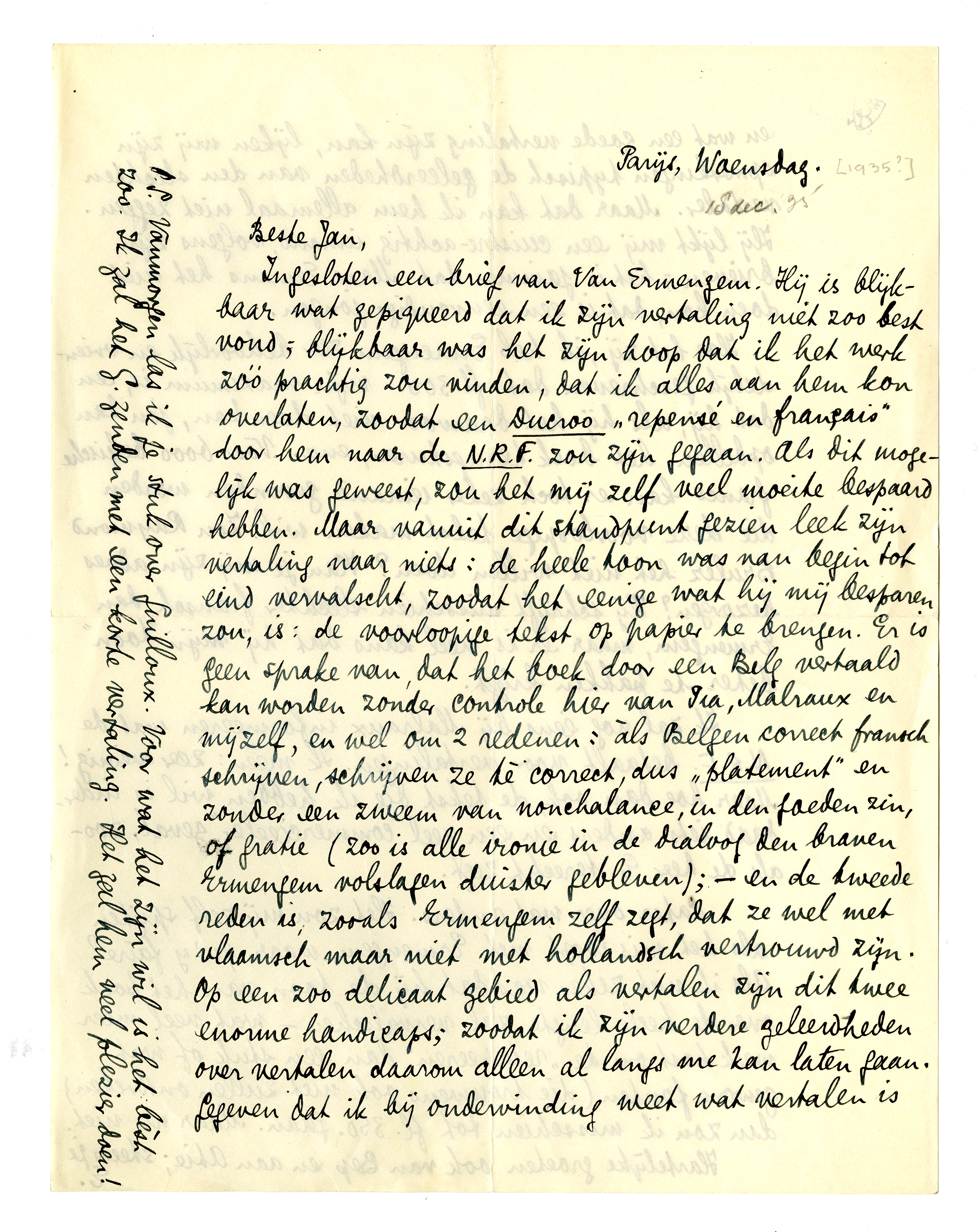 Ingesloten een brief van Van Ermengem. Hij is blijkbaar wat gepiqueerd dat ik zijn vertaling niet zoo best vond; blijkbaar was het zijn hoop dat ik het werk zóó prachtig zou vinden, dat ik alles aan hem kon overlaten, zoodat een Ducroo ‘repensé en français’ door hem naar de N.R.F. zou zijn gegaan. Als dit mogelijk was geweest, zou het mij zelf veel moeite bespaard hebben. Maar vanuit dit standpunt gezien leek zijn vertaling naar niets: de heele toon was van begin tot eind vervalscht, zoodat het eenige wat hij mij besparen zou, is: de voorloopige tekst op papier te brengen. Er is geen sprake van, dat het boek door een Belg vertaald kan worden zonder controle hier van Pia, Malraux en mijzelf, en wel om 2 redenen: àls Belgen correct fransch schrijven, schrijven ze tè correct, dus ‘platement’ en zonder een zweem van nonchalance, in den goeden zin, of gratie (zoo is alle ironie in de dialoog den braven Ermengem volslagen duister gebleven); - en de tweede reden is, zooals Ermengem zelf zegt, dat ze wel met vlaamsch maar niet met hollandsch vertrouwd zijn. Op een zoo delicaat gebied als vertalen zijn dit twee enorme handicaps; zoodat ik zijn verdere geleerdheden over vertalen daarom alleen al langs me kan laten gaan. Gegeven dat ik bij ondervinding weet wat vertalen is en wat een goede vertaling zijn kan, lijken mij zijn opmerkingen typisch de geleerdheden van den slechten vertaler. Maar dat kan ik hem allemaal niet zeggen. Hij lijkt mij een cuistre-achtig iemand, volgens zijn brieven; het is jammer dat Marc Eemans het niet doen kon, dat is een eenvoudige jongen.