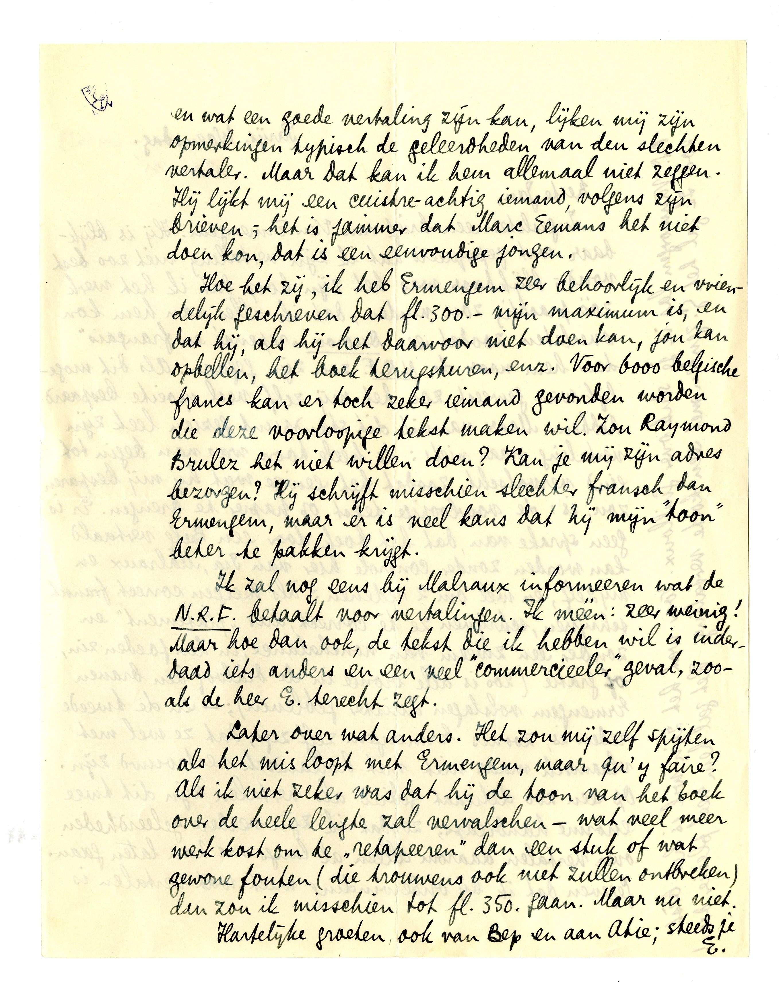 Ik zal nog eens bij Malraux informeeren wat de N.R.F. betaalt voor vertalingen. Ik méén: zeer weinig! Maar hoe dan ook, de tekst die ik hebben wil is inderdaad iets anders en een veel ‘commercieeler’ geval, zooals de heer E. terecht zegt.
