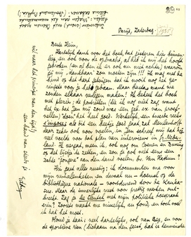 Hier gaat alles rustig; ik documenteer me voor mijn verhalenke-ten en dwaal nu - hoewel op de bibliothèque nationale - voortdurend door de Kaukasus. Maar de innerlijke rust voor prettig werken ontbreekt. Zag je De Sleutel met mijn politieke toespraak erin? Zooiets maakt me misselijk, au fond, en toch voel ik dat het moet.
