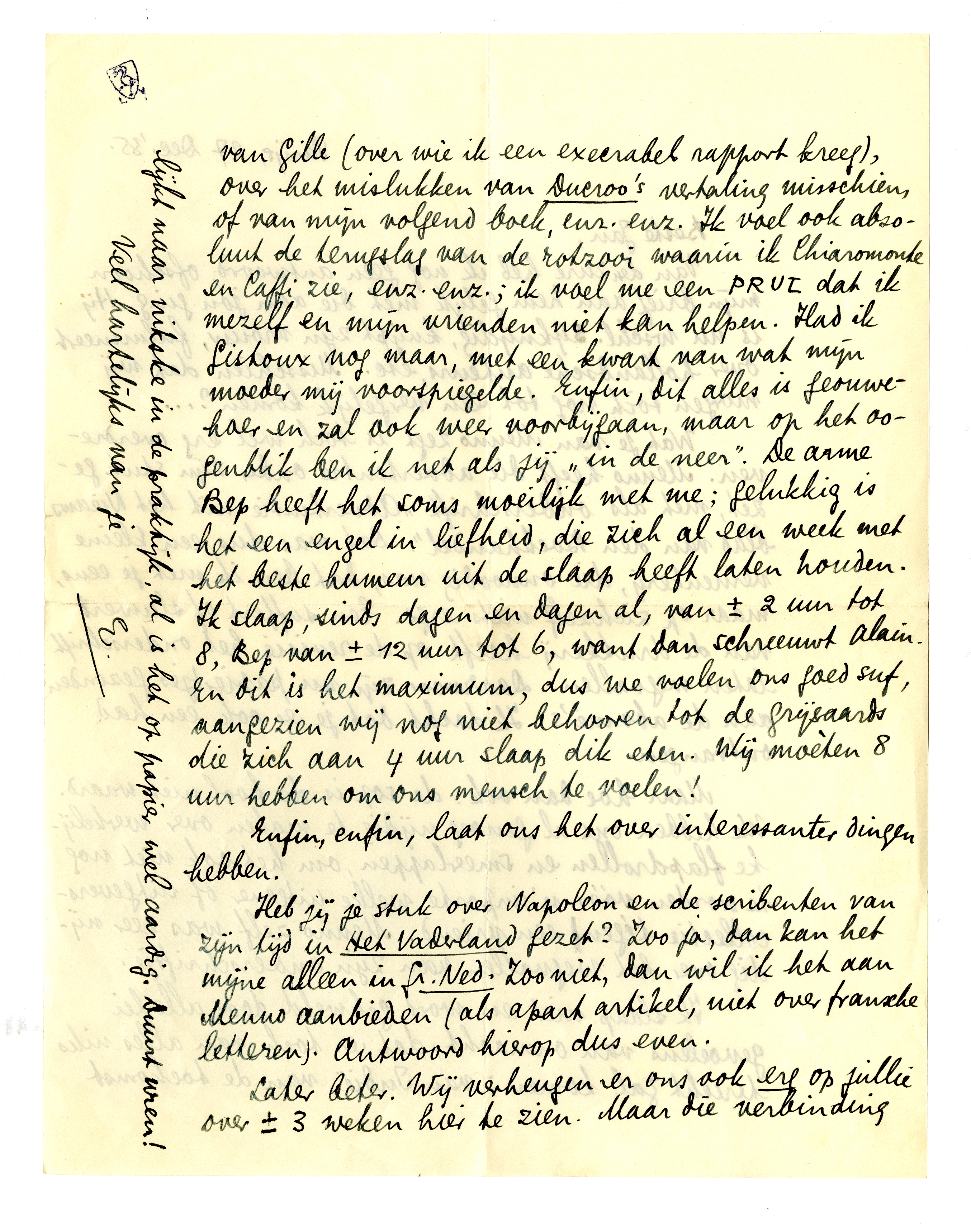 Heb jij je stuk over Napoleon en de scribenten van zijn tijd in Het Vaderland gezet? Zoo ja, dan kan het mijne alleen in Gr. Ned. Zoo niet, dan wil ik het aan Menno aanbieden (als apart artikel, niet over fransche letteren). Antwoord hierop dus even.