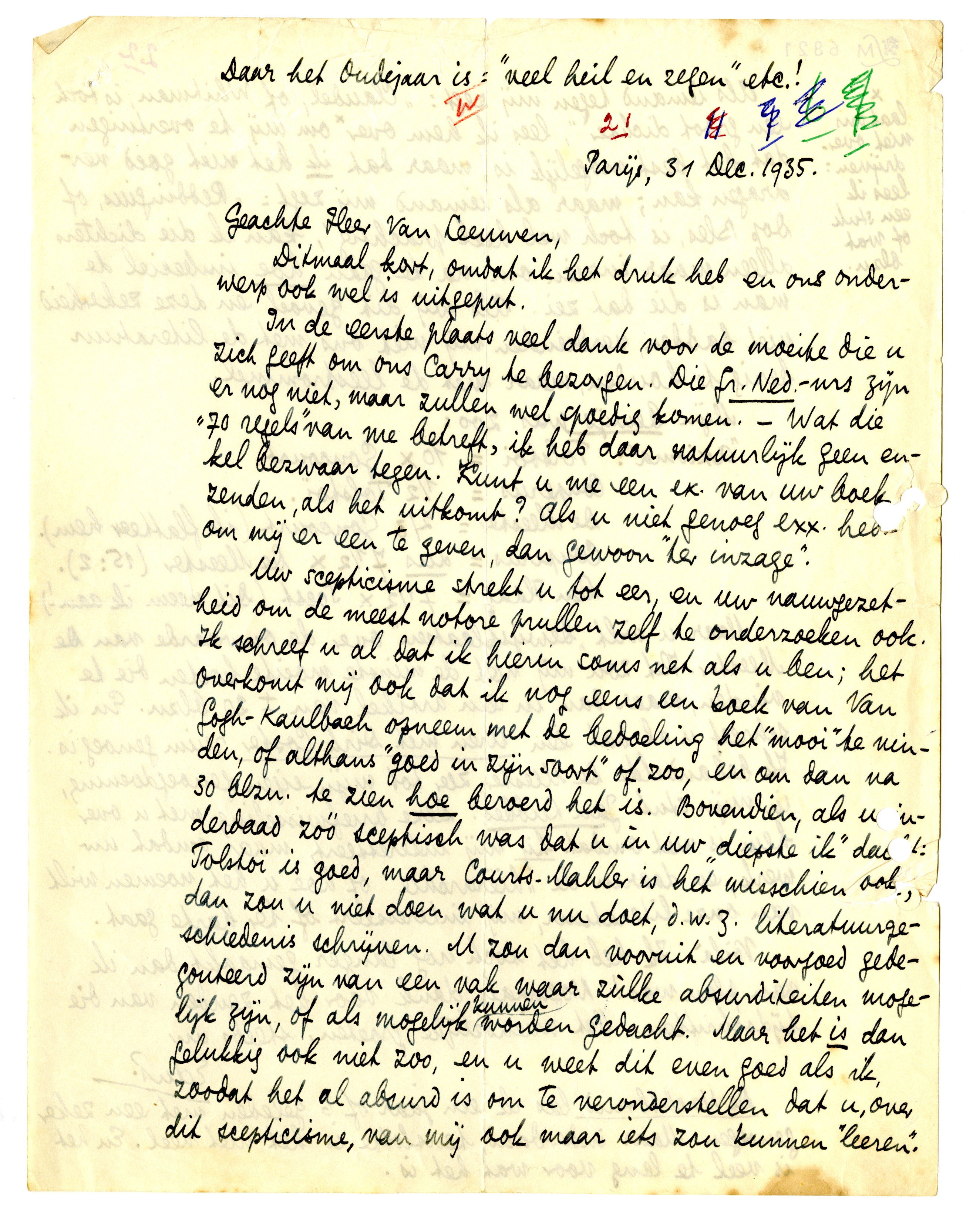 Uw scepticisme strekt u tot eer, en uw nauwgezetheid om de meest notore prullen zelf te onderzoeken ook. Ik schreef u al dat ik hierin soms net als u ben; het overkomt mij ook dat ik nog eens een boek van Van Gogh-Kaulbach opneem met de bedoeling het ‘mooi’ te vinden, of althans ‘goed in zijn soort’ of zoo, en om dan na 30 blzn. te zien hoe beroerd het is. Bovendien, als u inderdaad zóó sceptisch was dat u in uw ‘diepste ik’ dacht: Tolstoï is goed, maar Courts-Mahler is het misschien ook, dan zou u niet doen wat u nu doet, d.w.z. literatuurgeschiedenis schrijven. U zou dan vooruit en voorgoed gedegouteerd zijn van een vak waar zùlke absurditeiten mogelijk zijn, of als mogelijk kunnen worden gedacht. Maar het is dan gelukkig ook niet zoo, en u weet dit even goed als ik, zoodat het al absurd is om te veronderstellen dat u, over dit scepticisme, van mij ook maar iets zou kunnen ‘leeren’.