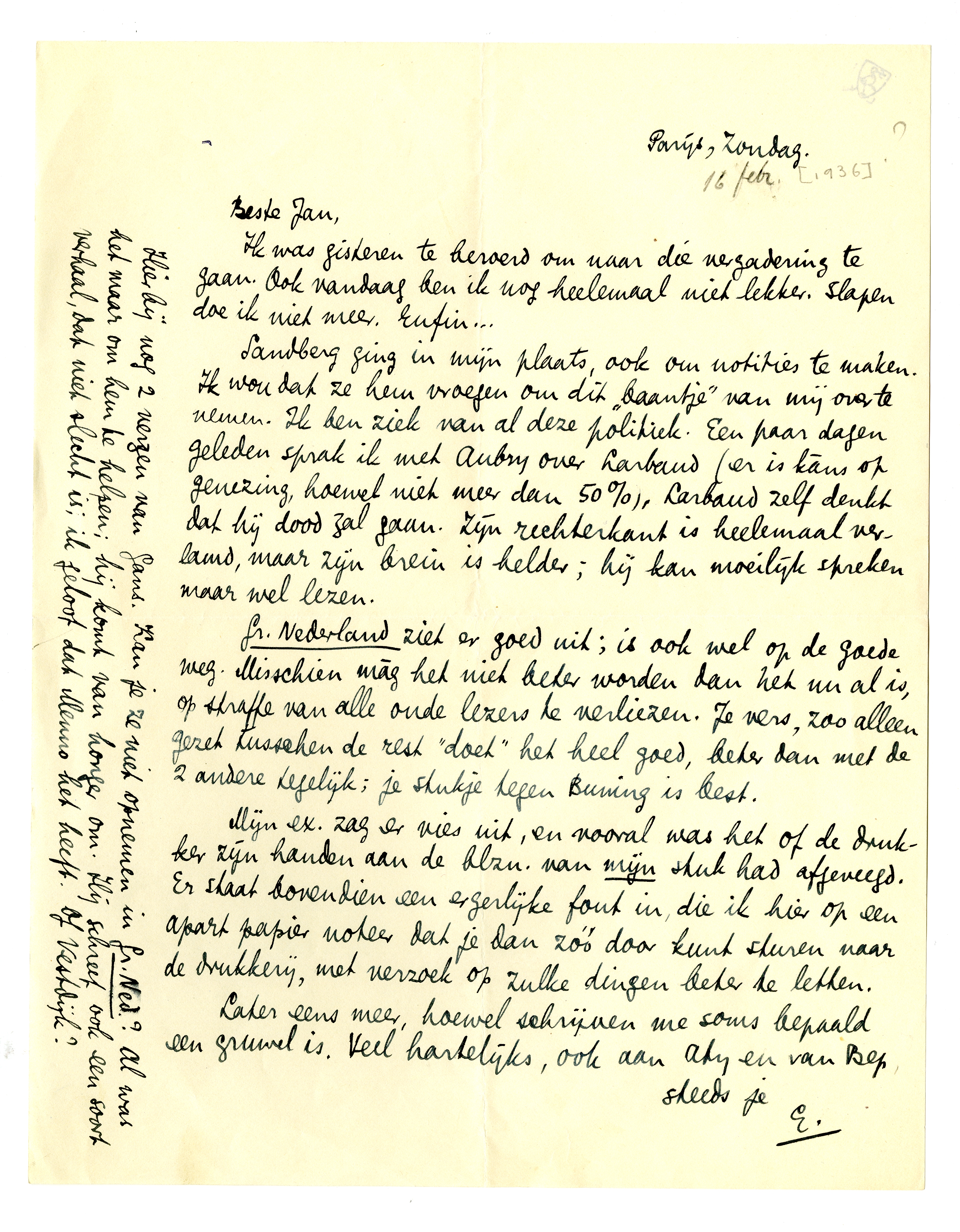 Sandberg ging in mijn plaats, ook om notities te maken. Ik wou dat ze hem vroegen om dit ‘baantje’ van mij over te nemen. Ik ben ziek van al dezepolitiek. Een paar dagen geleden sprak ik met Aubry4036 over Larbaud (er is kàns op genezing, hoewel niet meer dan 50%). Larbaud zelf denkt dat hij dood zal gaan. Zijn rechterkant is heelemaal verlamd, maar zijn brein is helder; hij kan moeilijk spreken maar wel lezen.