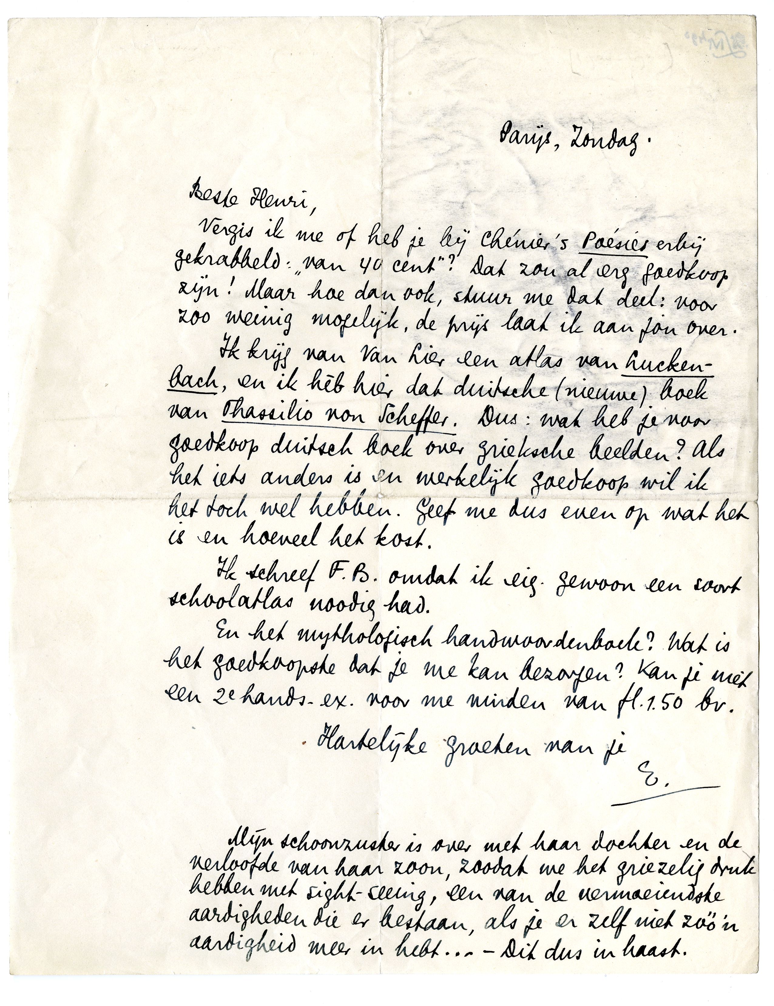 Ik krijg van Van Lier een atlas van Luckenbach,4060 en ik hèb hier dat duitsche (nieuwe) boek van Thassilio von Scheffer. Dus: wat heb je voor goedkoop duitsch boek over grieksche beelden? Als het iets anders is en werkelijk goedkoop wil ik het toch wel hebben. Geef me dus even op wat het is en hoeveel het kost.