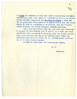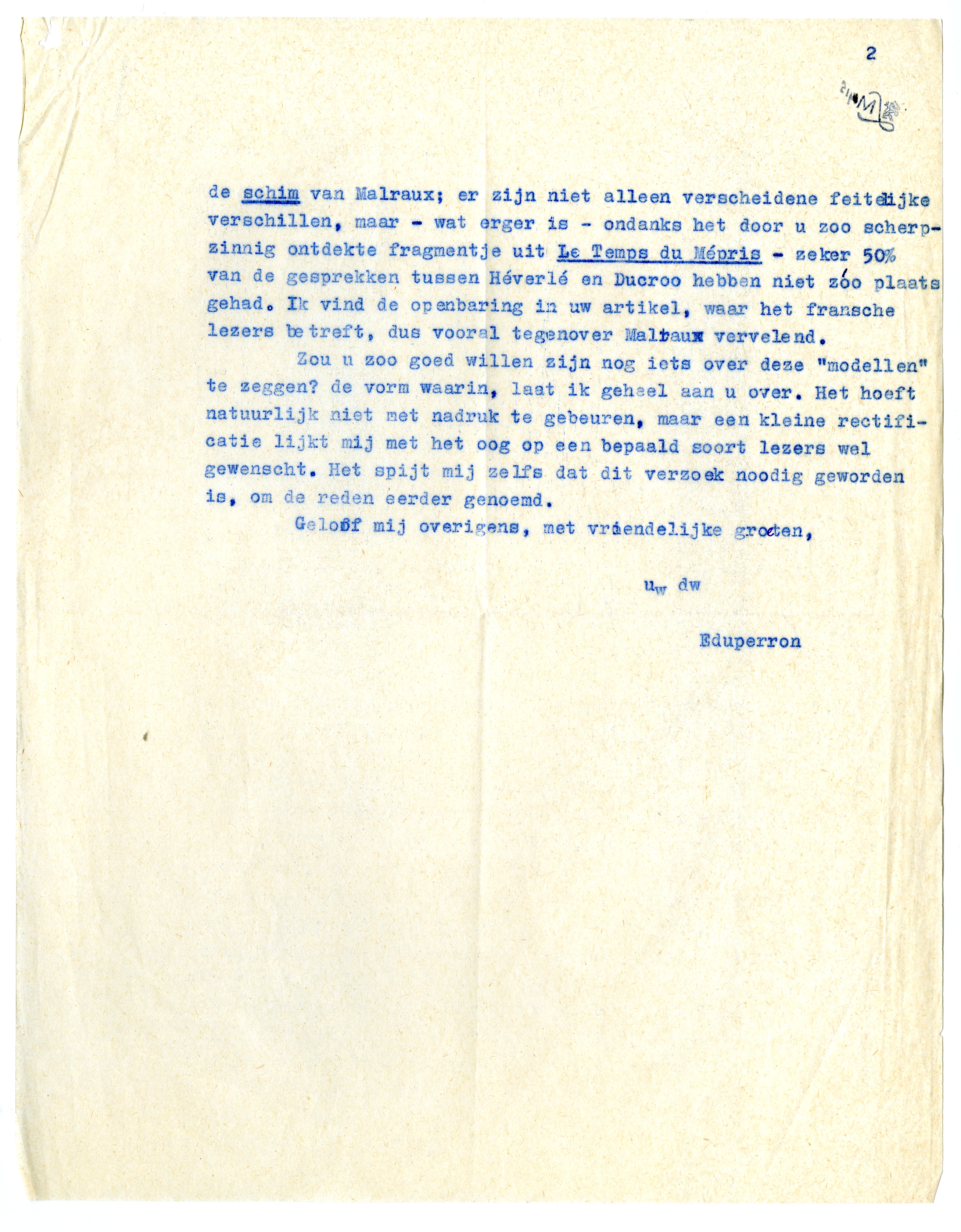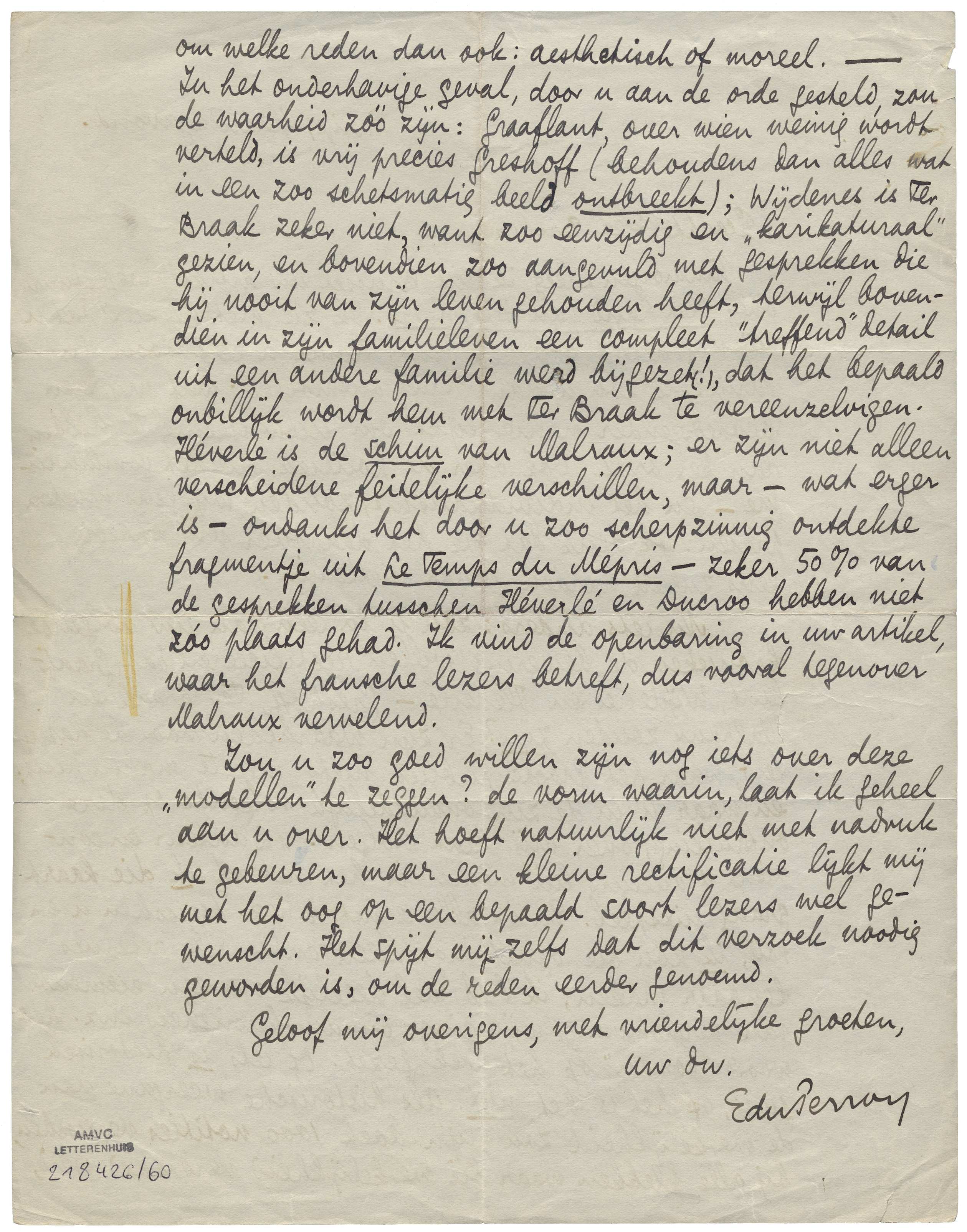Nu iets anders: zou u in een van uw volgende kronieken de bewering willen rectificeeren4076 dat Graaflant, Wijdenes en Héverlé - Greshoff, Ter Braak en Malraux zouden zijn? Er zijn waarheden voor de happy few, waar het groote publiek niets mee te maken heeft; en waar u in de zin, onmiddellijk volgende op deze onthulling, over mij laat volgen: ‘L'auteur en convient d'ailleurs lui-même’ is het net of ik die kaart graag uitspeel. En in alle ernst, d.w.z. tusschen u en mij, ik zou die opvatting alleen onder alle reserves kenbaar maken; ik heb wel degelijk om een element van vermomming, wijziging, onnauwkeurigheid enz. het woord ‘roman’ op het boek gezet. Of iets is historisch juist, of het is het niet. Als historische weergave van de werkelijkheid zou mijn boek 1000 notities vereischen, bij alle plekken waar die werkelijkheid verdraaid werd, om welke reden dan ook: aesthetisch of moreel. - In het onderhavige geval, door u aan de orde gesteld, zou de waarheid zóó zijn: Graaflant, over wien weinig wordt verteld, is vrij precies Greshoff (behoudens dan alles wat in een zoo schetsmatig beeld ontbreekt); Wijdenes is Ter Braak zeker niet, want zoo eenzijdig en ‘karikaturaal’ gezien, en bovendien zoo aangevuld met gesprekken die hij nooit van zijn leven gehouden heeft, terwijl bovendien in zijn familieleven een compleet ‘treffend’ detail uit een andere familie werd bijgezet(!), dat het bepaald onbillijk wordt hem met Ter Braak te vereenzelvigen. Héverlé is de schim van Malraux; er zijn niet alleen verscheidene feitelijke verschillen, maar - wat erger is - ondanks het door u zoo scherpzinnig ontdekte fragmentje uit Le Temps du Mépris - zeker 50% van de gesprekken tusschen Héverlé en Ducroo hebben niet zóo plaats gehad. Ik vind de openbaring in uw artikel, waar het fransche lezers betreft, dus vooral tegenover Malraux vervelend.