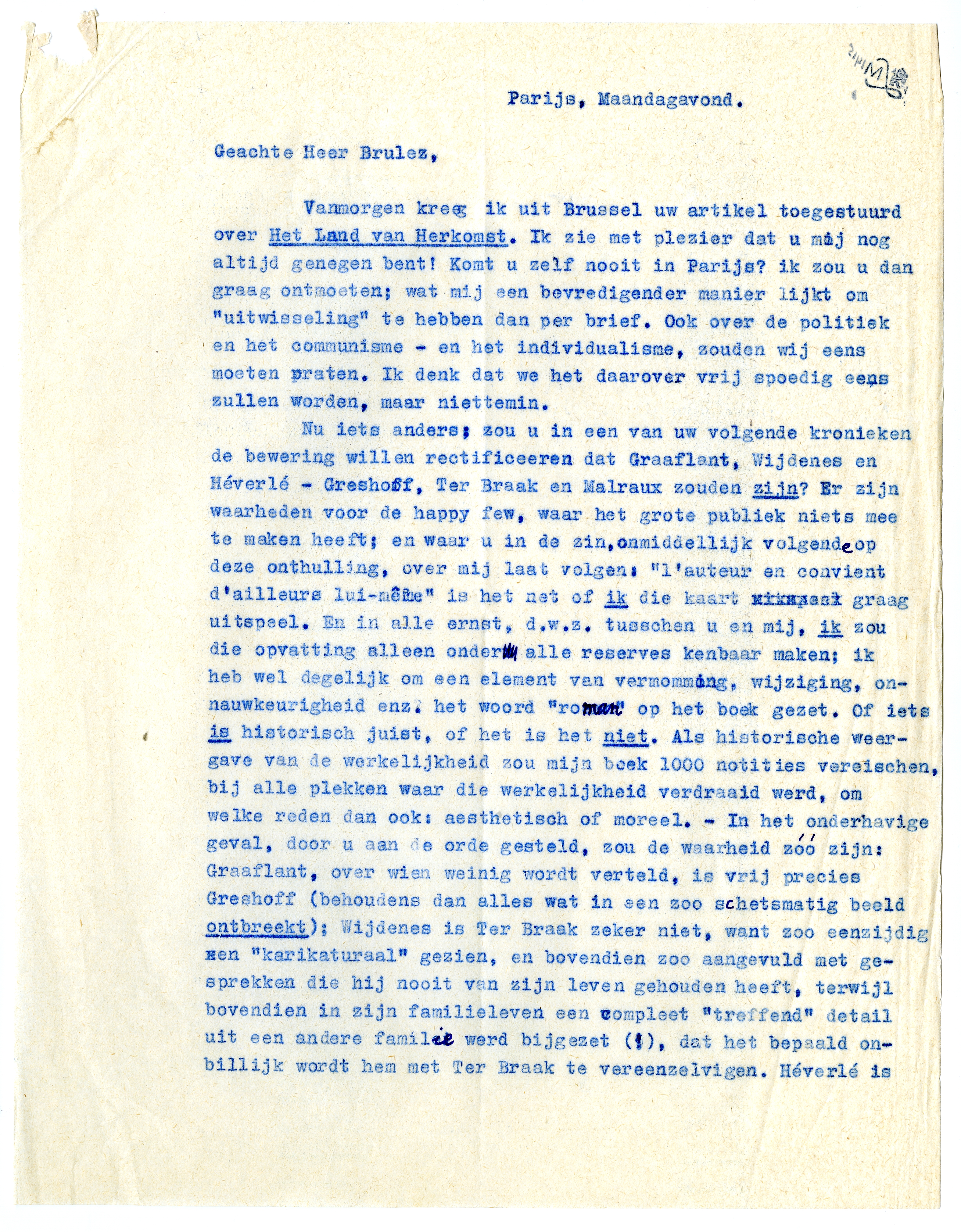 Vanmorgen kreeg ik uit Brussel uw artikel toegestuurd over Het Land van Herkomst.4075 Ik zie met plezier dat u mij nog altijd genegen bent! Komt u zelf nooit in Parijs? ik zou u dan graag ontmoeten; wat mij een bevredigender manier lijkt om ‘uitwisseling’ te hebben dan per brief. Ook over de politiek en het communisme - en het individualisme, zouden wij eens moeten praten. Ik denk dat we het daarover vrij spoedig eens zullen worden, maar niettemin.