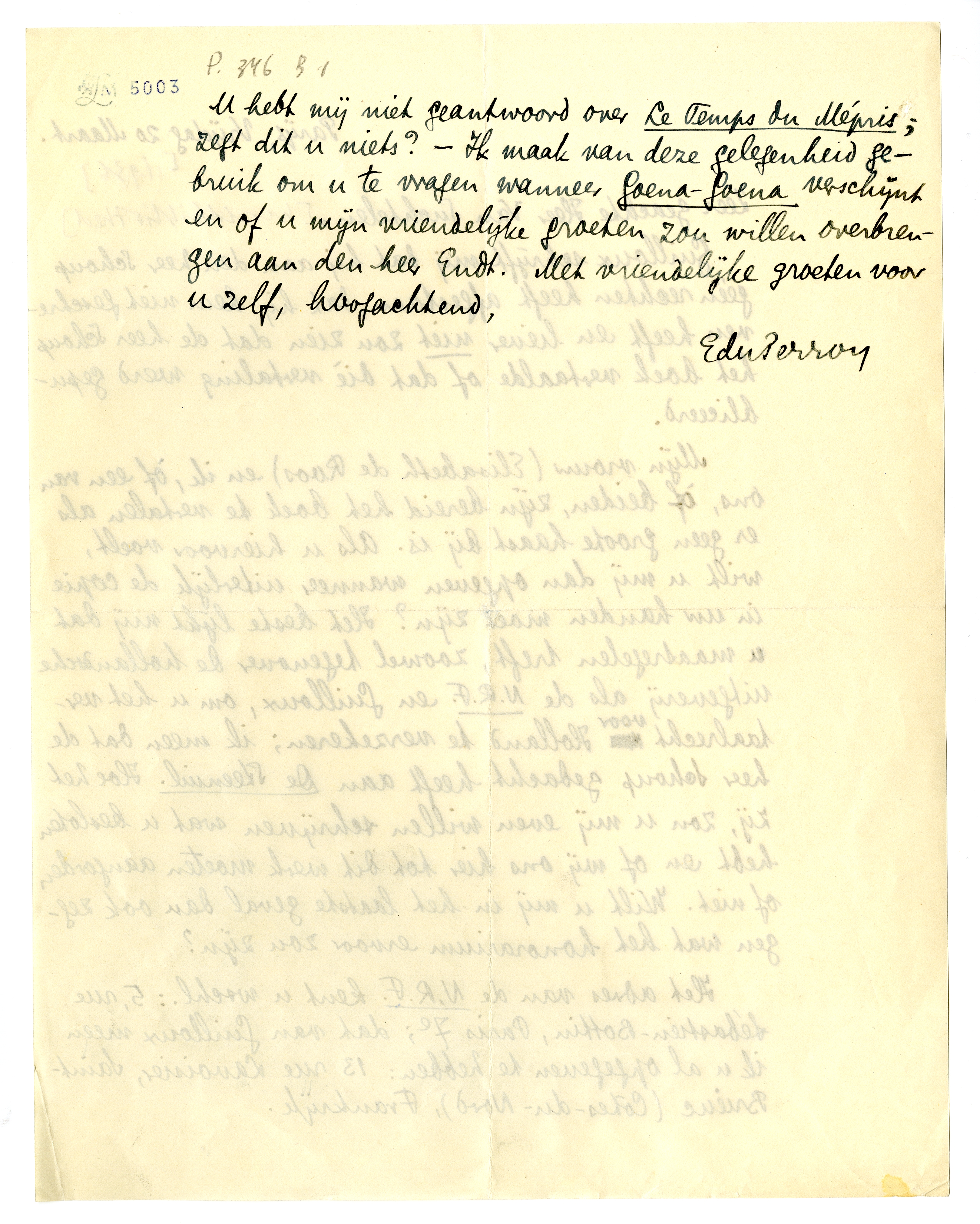 U hebt mij niet geantwoord over Le Temps du Mépris; zegt dit u niets? - Ik maak van deze gelegenheid gebruik om u te vragen wanneer Goena-Goena verschijnt en of u mijn vriendelijke groeten zou willen overbrengen aan den heer Endt.