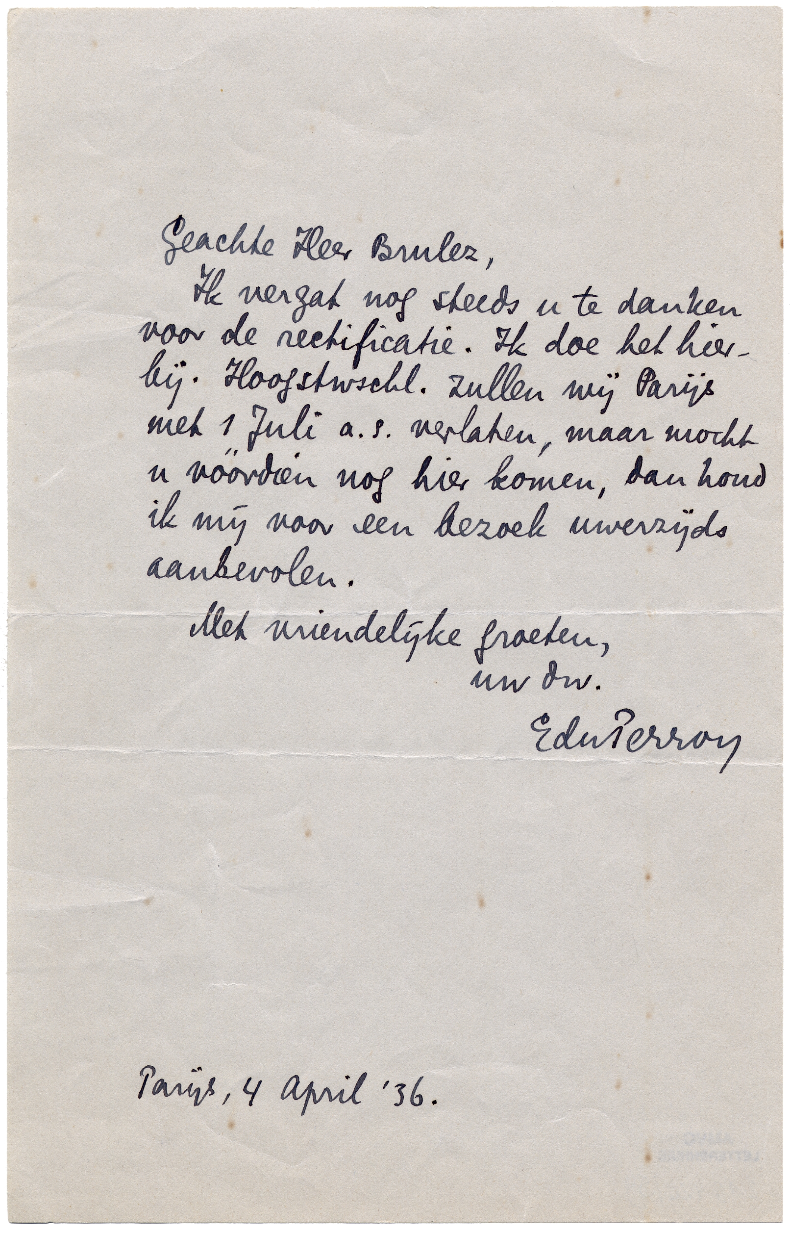 Ik vergat nog steeds u te danken voor de rectificatie. Ik doe het hierbij. Hoogstwschl. zullen wij Parijs met 1 Juli a.s. verlaten, maar mocht u vóórdien nog hier komen, dan houd ik mij voor een bezoek uwerzijds aanbevolen.
