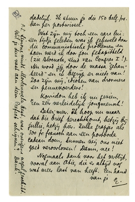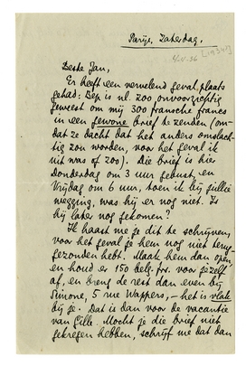 Er heeft een vervelend geval plaatsgehad: Bep is nl. zoo onvoorzichtig geweest om mij 300 fransche francs in een gewone brief te zenden (omdat ze dacht dat het anders omslachtig zou worden, voor het geval ik uit was of zoo). Die brief is hier Donderdag om 3 uur gebust, en Vrijdag om 6 uur, toen ik bij jullie wegging, was hij er nog niet. Is hij later nog gekomen?