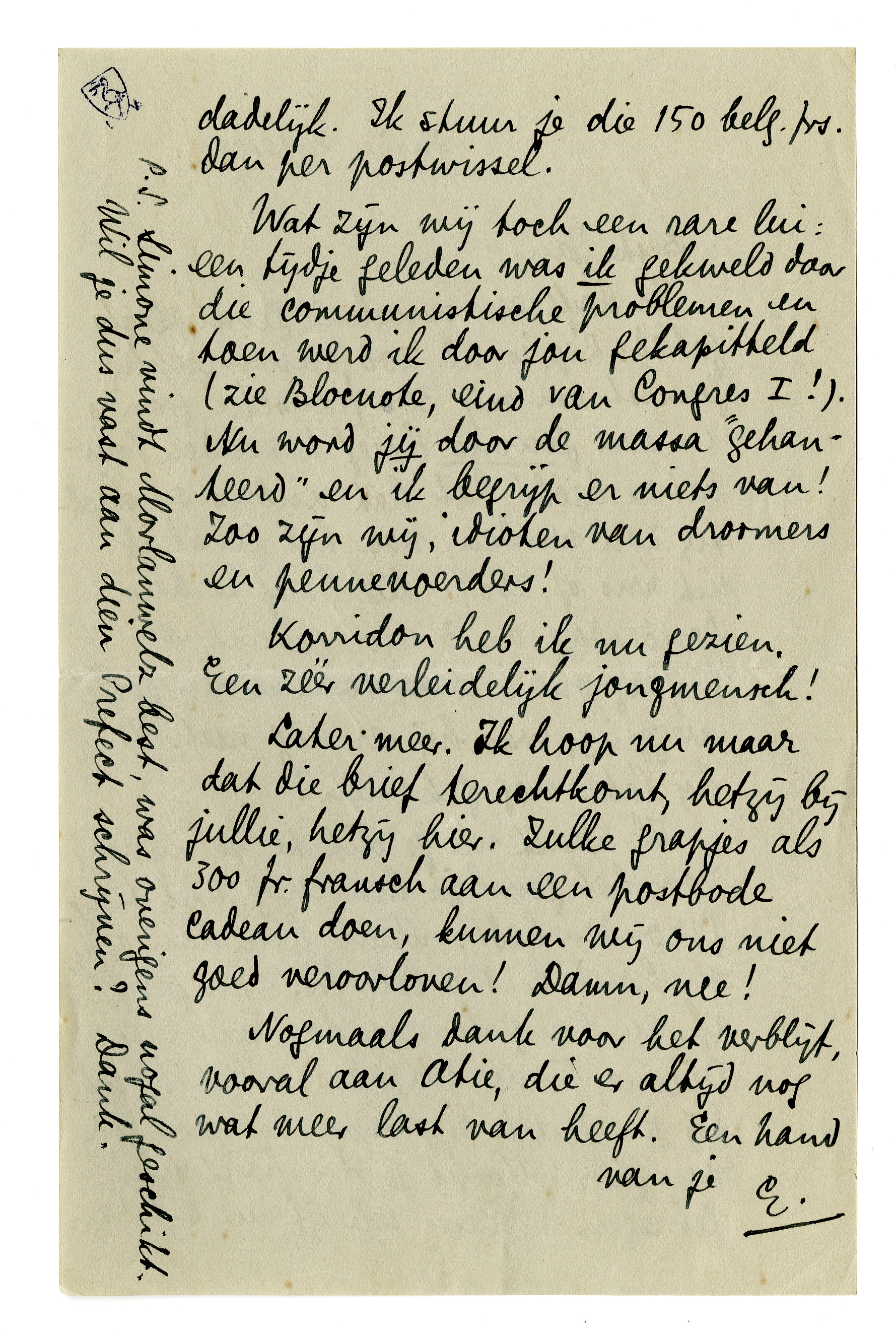 Later meer. Ik hoop nu maar dat die brief terechtkomt, hetzij bij jullie, hetzij hier. Zulke grapjes als 300 fr. fransch aan een postbode cadeau te doen, kunnen wij ons niet goed veroorloven! Damn, nee!
